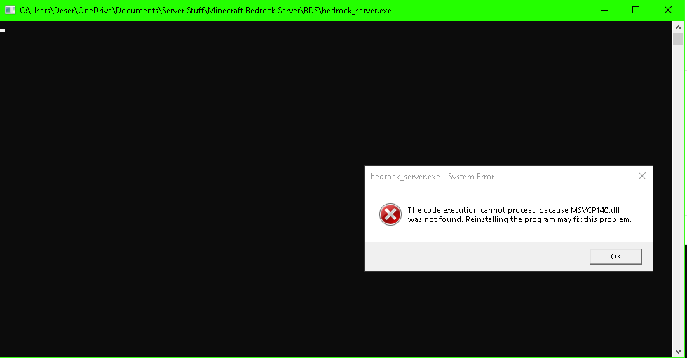 Hello. So I was setting up a server and when I went to open the .exe files, it gave me errors. It is annoying, but hopefully, it will be fixed. I have tried everything to try to fix it including copying files from my bds server (using a hosting company, Ramshard) and transferring the files to my PC. I am running Windows 10 home. Specs: