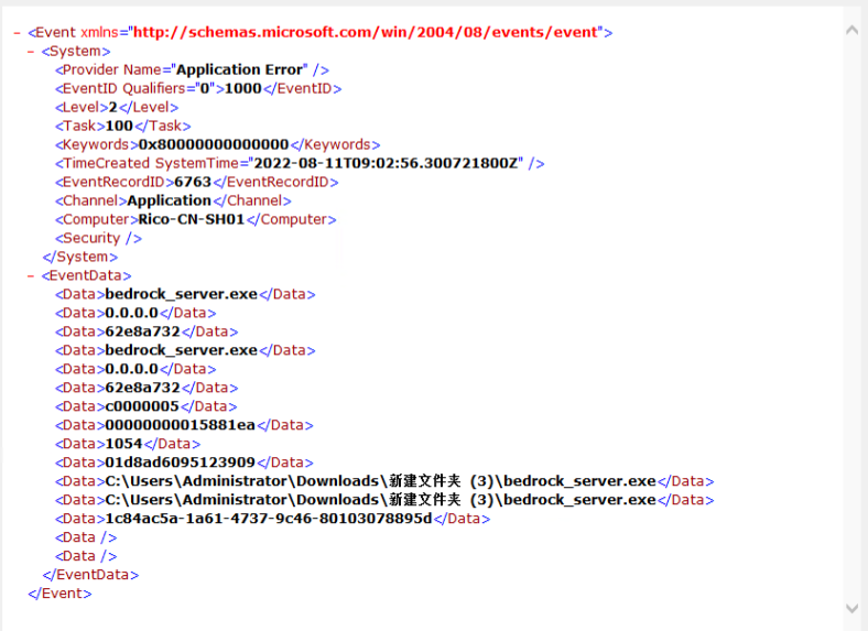 Minecraft bedrock server always crashes after everybody disconnects from the game. I can still start the server and players are able to join. But as soon as we all disconnect, the server crashes. I have just updated the server to 1.19.20, it has never crashed like this in the past. My world(about 160MB) has a lot of entities and blocks, with two custom resource packs(for changing the paintings and music discs) and experimental gameplay(custom biomes and spectator mode). I don't know if my world leads to the problem, but it's fine on previous versions(1.18-1.19.10). The CPU and RAM usage is also normal. The crash log from Windows Event viewer is in the attachment, and I can provide the world file if needed.