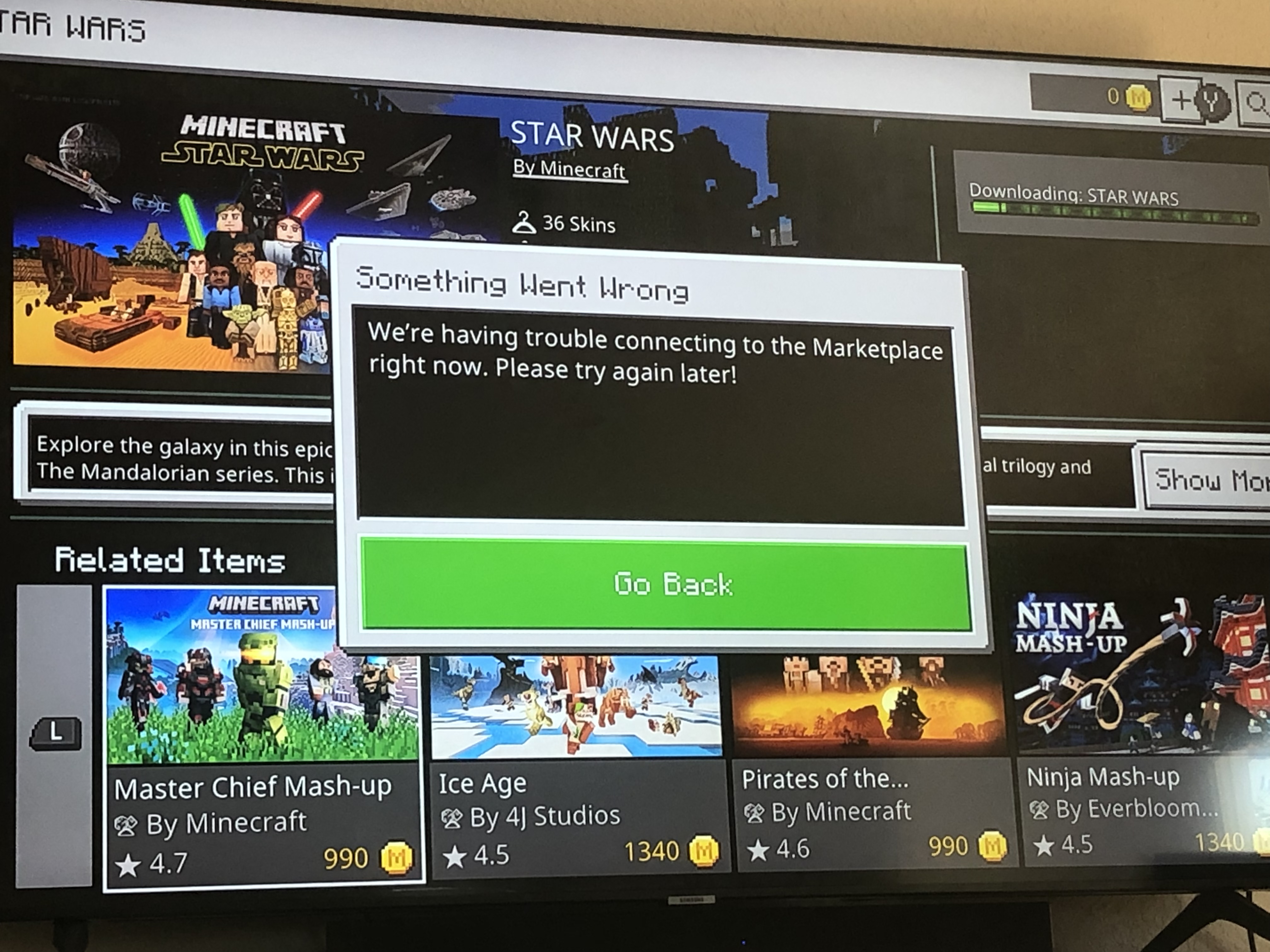 The mash up Star Wars won't download. Keep saying that I can't connect to the market Place. Every time someone tries to join my world on multiplayer as a player the software crashes. Each time I do something on the marketplace keeps telling me it can't connect to marketplace try again later. I play on a Nintendo switch please fix the issue