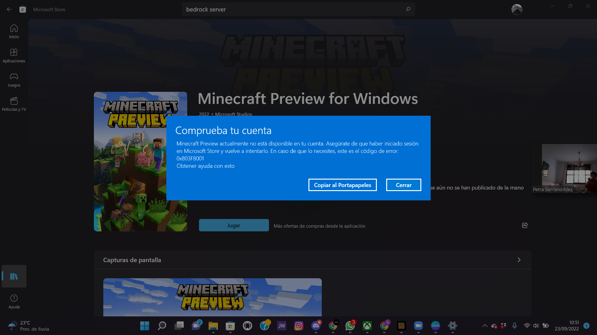 I wanted to tell you that when I open Minecraft Preview, I get the error code: 0x803F8001, telling me that I can't play it because I'm not signed in to the Microsoft Store, but I have my account signed in to this service. I don't know what I should do to be able to test it.