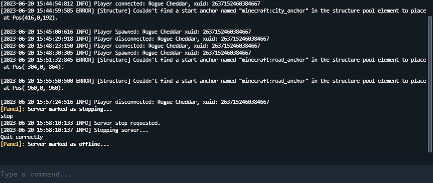 "[2023-06-20 15:51:32:845 ERROR] [Structure] Couldn't find a start anchor named "minecraft:road_anchor" in the structure pool element to place at Pos(-304,0,-864)."