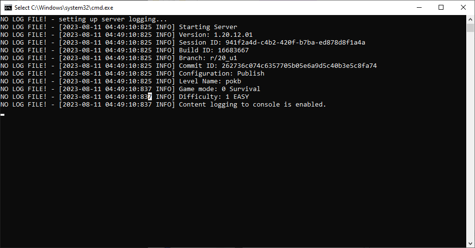When running multiple BDS server instances (`bedrock_server.exe`) it causes a bug and displays "NO LOG FILE! -" before every line.