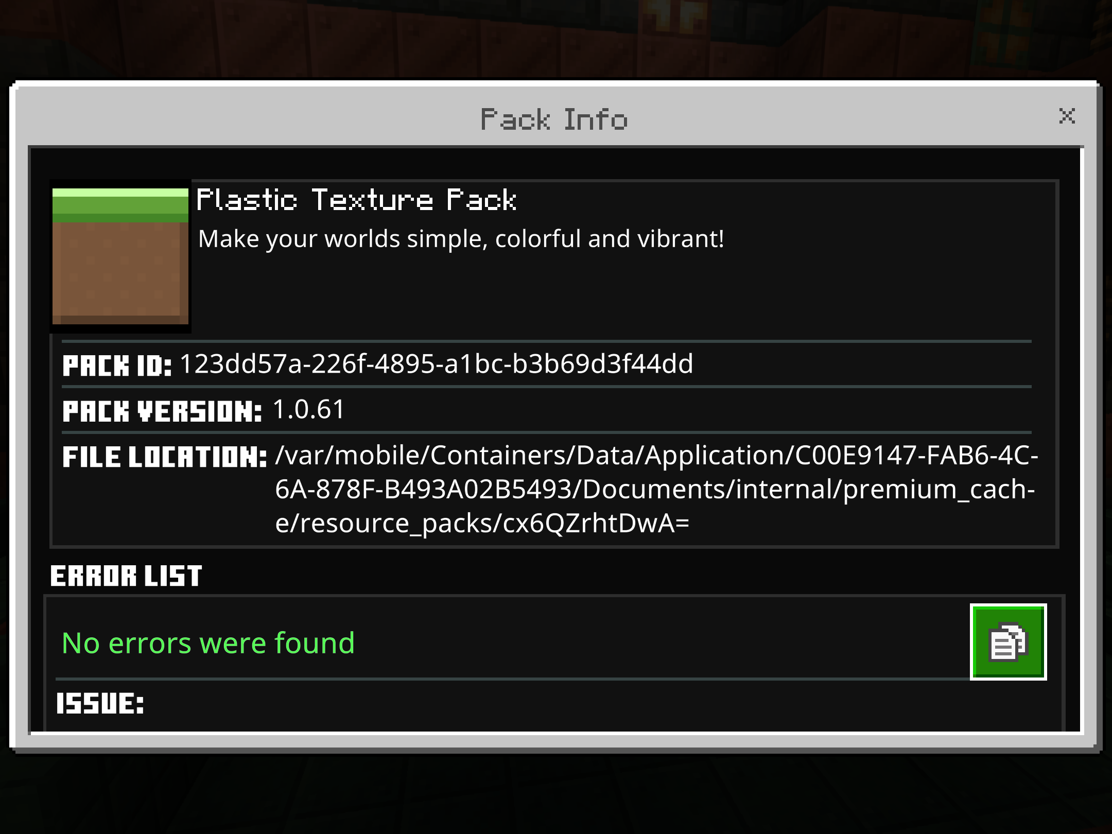 I tried to used a texture pack, plastic texture pack, and it said there was a problem loading one of the pack. When I clicked it, it said there was no error. There was nothing wrong in files.