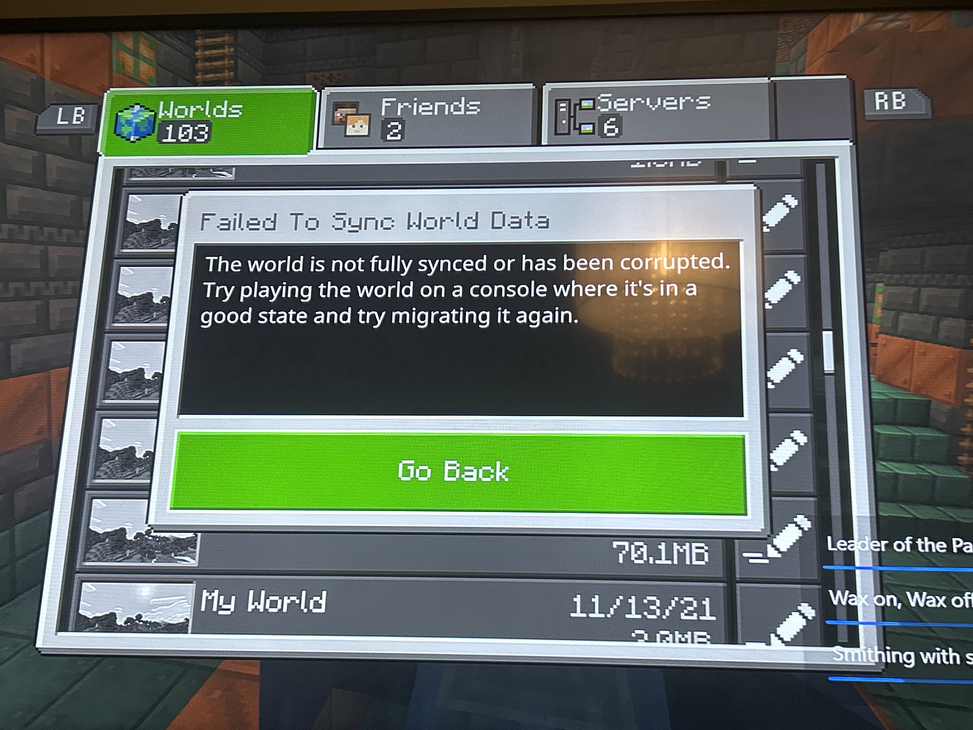 My world is 500mb and I try load it and it keeps saying that the world is not fully synced and I need to try migrate it with and older console which I no longer have