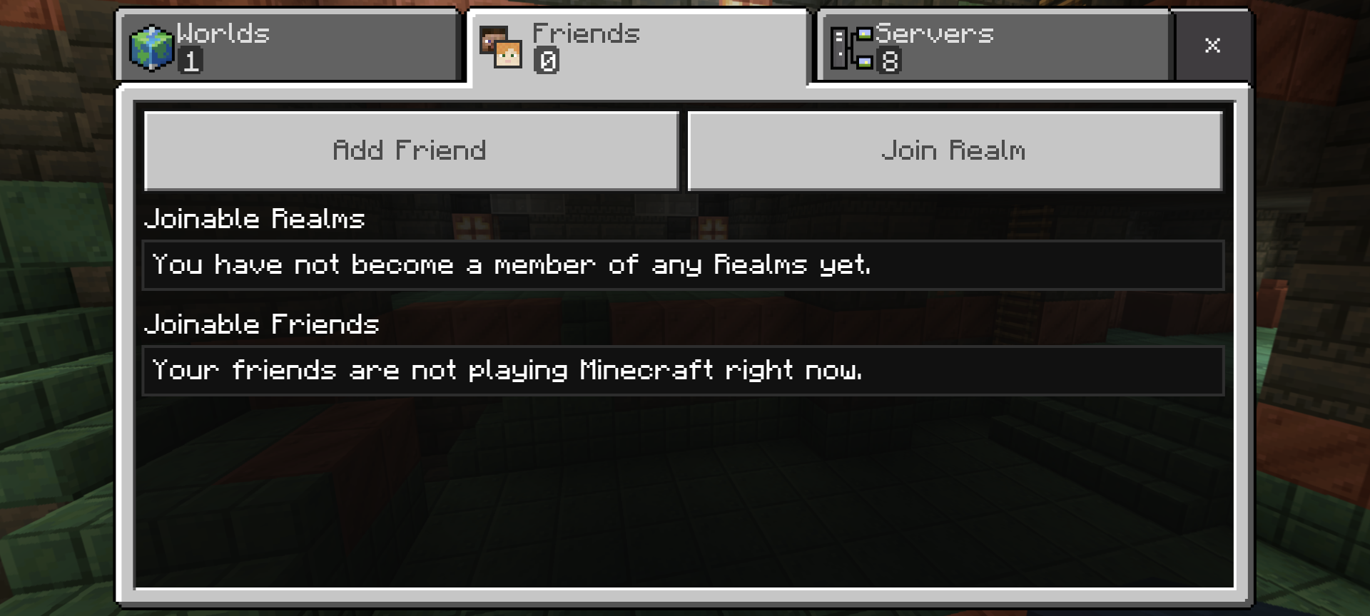 When opening instances of the game on Xbox, Nintendo Switch, and Android, it does not show up in the Worlds or Friends Tabs. I don't have access to a Windows machine to test if it shows up there but would assume the same behavior is present. See attachments for Android Screenshots.