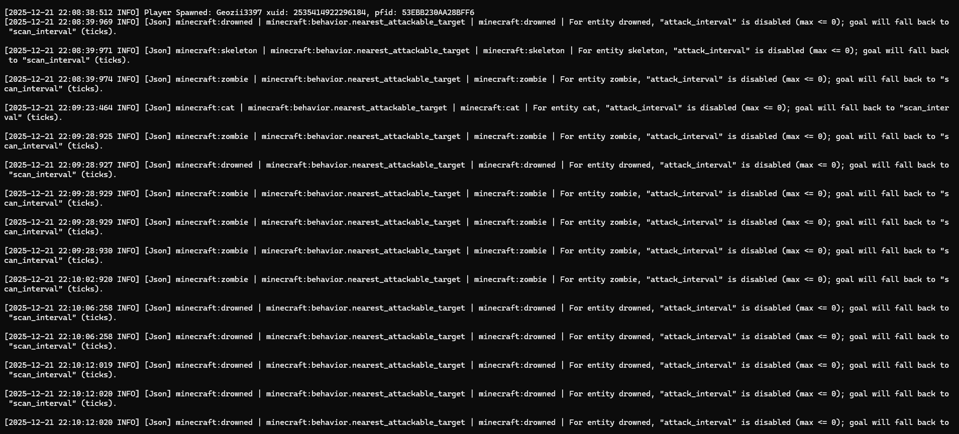 [2025-12-21 22:08:24:841 INFO] [Json] minecraft:entity| minecraft:behavior.nearest_attackable_target | minecraft:entity | For entity entity, "attack_interval" is disabled (max <= 0); goal will fall back to "scan_interval" (ticks).