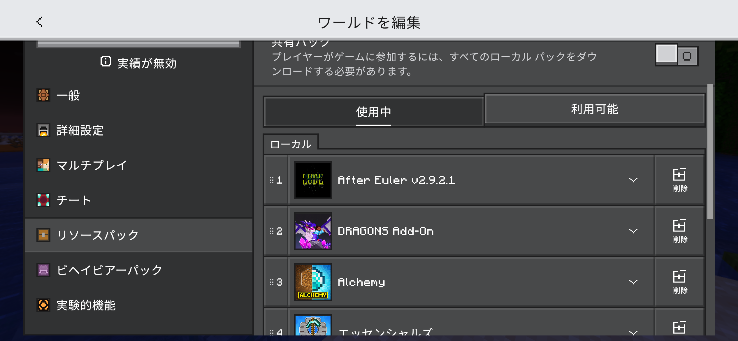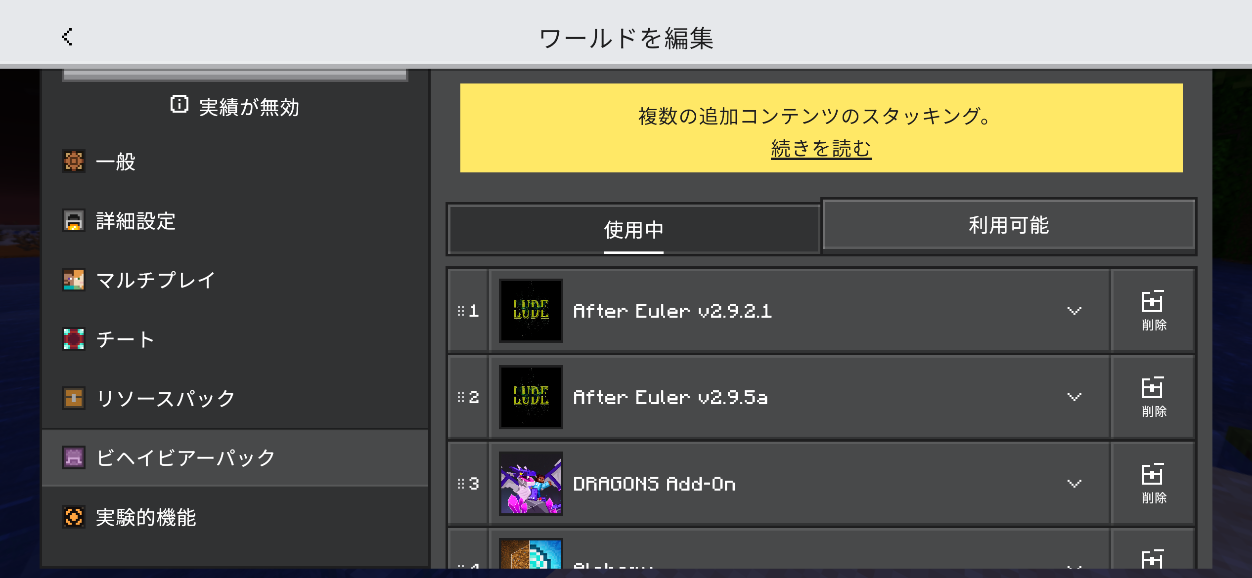 The latest version of the addon in the image is version 2.9.5a. The older version, resourcepack 2.9.2.1, overlaps with the latest version, resourcepack 2.9.5a, and I can no longer import it. I thought I had deleted the old resourcepack 2.9.2.1 and behaviorpack 2.9.2.1, but they are still remaining and being applied. I deleted all the resourcepacks and behaviorpacks and tried importing again, but the problem persisted.