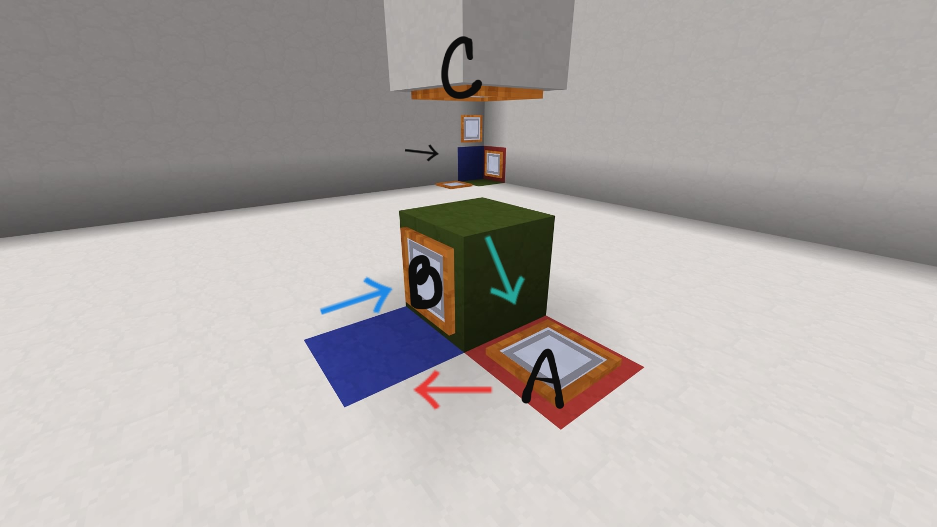 Same goes for the item frame on the ceiling(C). I can't have an item frame on the floor if one is on the ceiling. In the Conor of the wall I show that I can't place 2 item frames on the other colored blocks because the red one is on it already. Java Minecraft allows me to place them next to each other so I don't see why i can't do it here. I know this issue won't be an actual fix or patch, but I enjoy playing on Bedrock very much and figure I'd mention this since I was frustrated by it. Hopefully item frames can be next to each other? I don't know