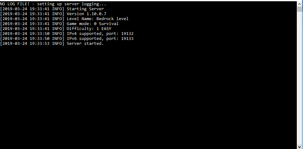 Every time I start up the server, the server never starts listening on either port. Not sure why, and this has happened on both computers I have tried it on. Port forwarding and Firewall set up correctly, as I used a port listener for ports 19132 and 19133 and received a success message.