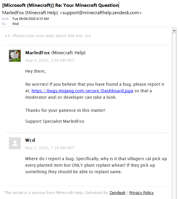 Please note though the information you've provided isn't enough for a valid bug report. Please head over to http://help.mojang.com/customer/portal/articles/801354-writing-helpful-bug-reports-for-minecraft before logging a new report and make sure to include steps to reproduce the issue no matter how simple you think it should be to understand. It helps to make sure future testing of the issue is uniform.
