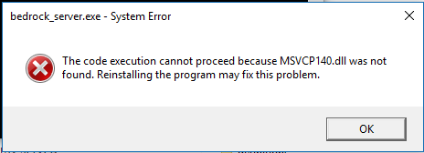 I installed the .zip file and then unpacked it into a new file on the C: drive of my computer. I did as the instructions stated on the bedrock_server_how_to.html and opened the bedrock_server.exe file as stated. It came up with an error message which read: The code execution cannot proceed because MSVCP140.dll not found. Reinstalling the program may fix this problem. I did as i was instructed and reinstalled it to see whether it would work and again, it didn't. Please try and fix this issue as i am wanting to set up my server, but i haven't even been able to get to the 'first' step.