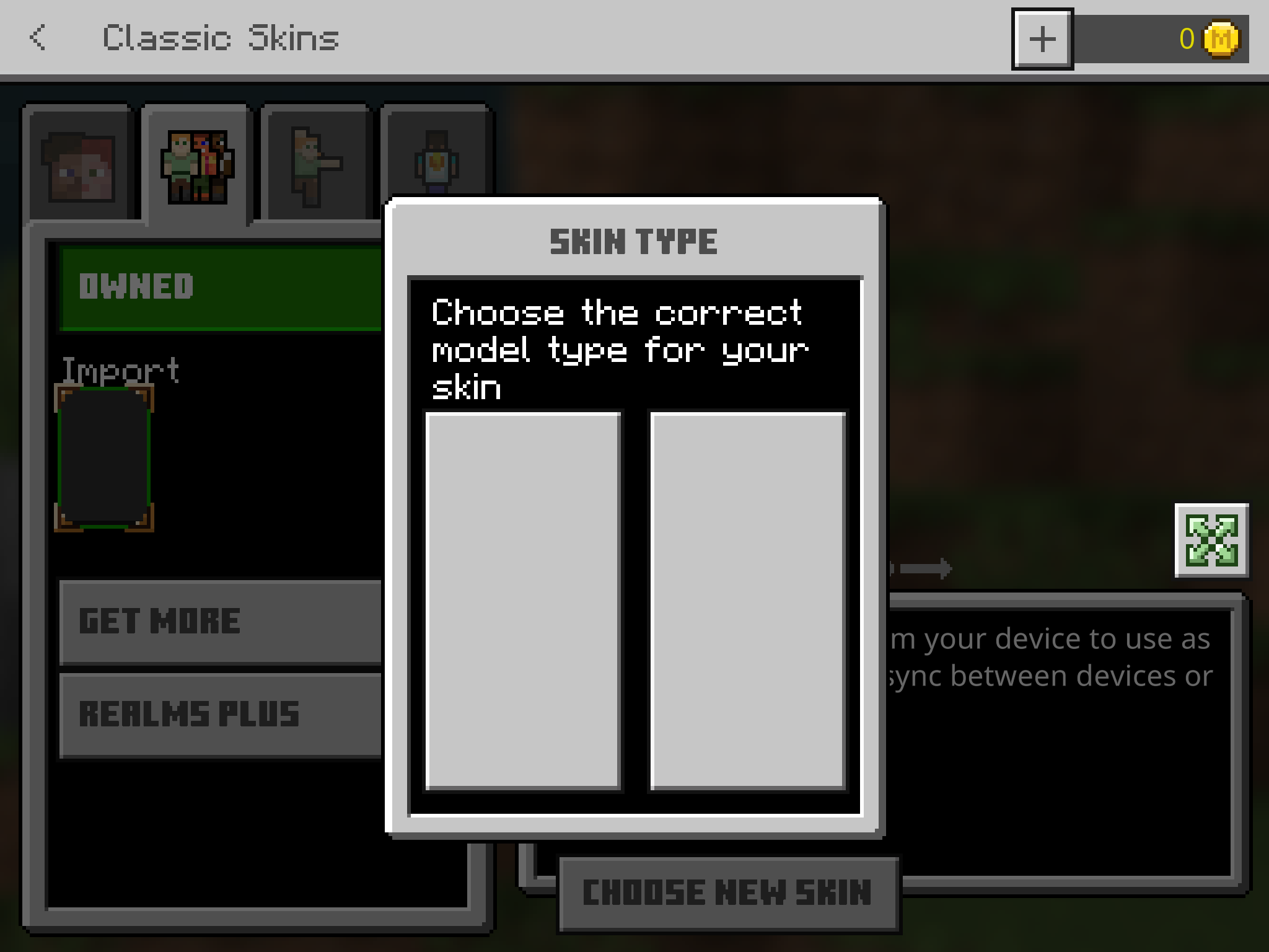 I don’t know if this is happening to anyone else, but I can’t change my skin anymore. Let me start from the beginning. I had a Character skin on for awhile now, and wanted to change it. But when I did,the skin I was wearing before showed up on the model type thing that shows up after you pick a skin. I tried to change to multiple different skins, when I came up with the idea to pick a different type of model. When I did though, I couldn’t see the skin at all, and whenever I tried changing it again, it just showed up invisible, and when logging into a world, the default Steve skin with the yellow shirt was my character.