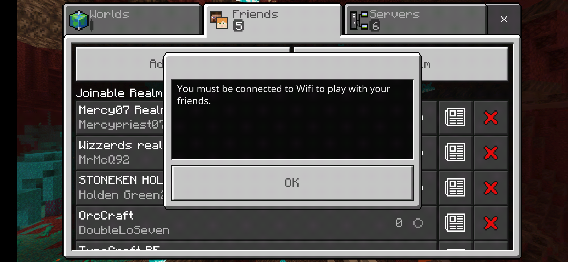 I have always played using my data. On Monday night 11/16 I tried to play on the realm I'm in. It gave me a pop up saying I can only play with friends using wifi. I checked my settings to see that my data usage was still turned on. I uninstalled the app and tried again. It still gives me that pop up. I would play on wifi but mine doesn't work half the time.