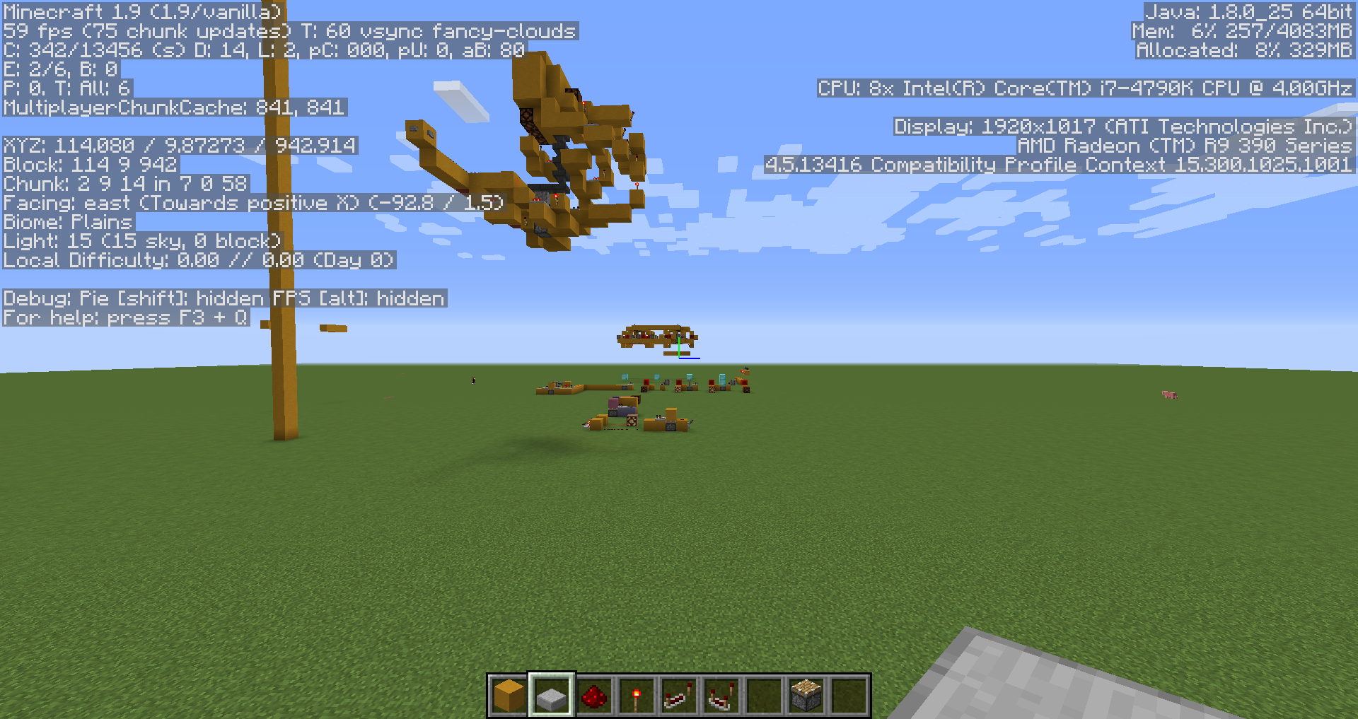 The attached images display a binary counter with a one tick pulse provided to its input. When close to the counter there is no issue, but when I move a few chunks away from it the blocks being moved by the pistons start to duplicate. This could obviously be used to create unlimited resources and poses an issue for redstone contraptions. The first image shows a clear circuit design; the second shows chunk stats; the third shows the circuit from three chunks away; the forth shows the circuit after the bug has taken place and the fifth image shows the input circuit.