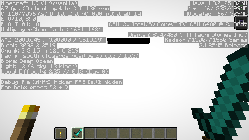 Upon applying blindness and night vision to myself, most of the screen goes white, except for items in both hands, hotbar, and occasional black boxes. Same effect can be obtained by having night vision and flying into the void. The black box is fixed in the Minecraft world (moves as I rotate screen).