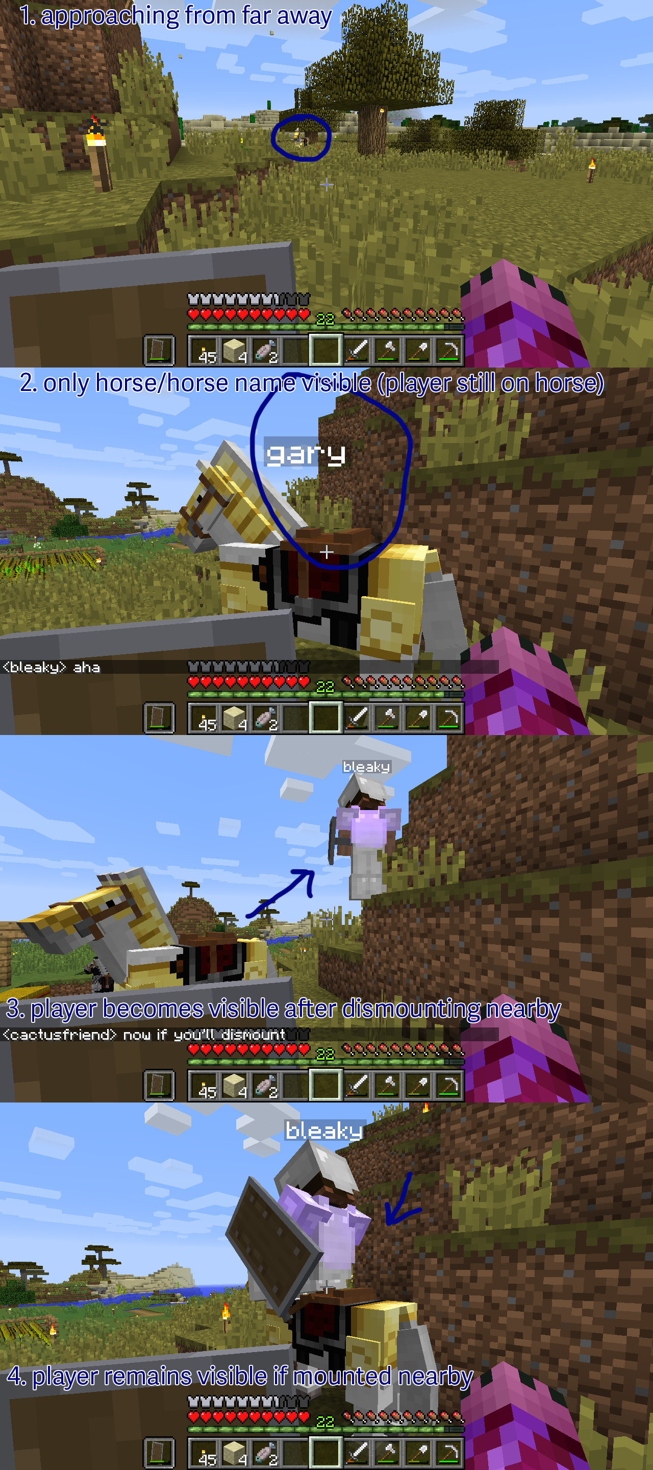 On a multiplayer server, when another player approaches (from out of view/another chunk) while mounted to a horse, boat, minecart, or similar, the player does not appear on the rideable entity. The rideable entity appears to move on its own, though it's controlled by the player. If named, only the entity's name is shown. If the other player dismounts nearby they're seen properly, and then they can mount the entity again and are still visible. It seems to only happen if they've changed to the mounted state when in another chunk or outside of viewing distance (not sure which).