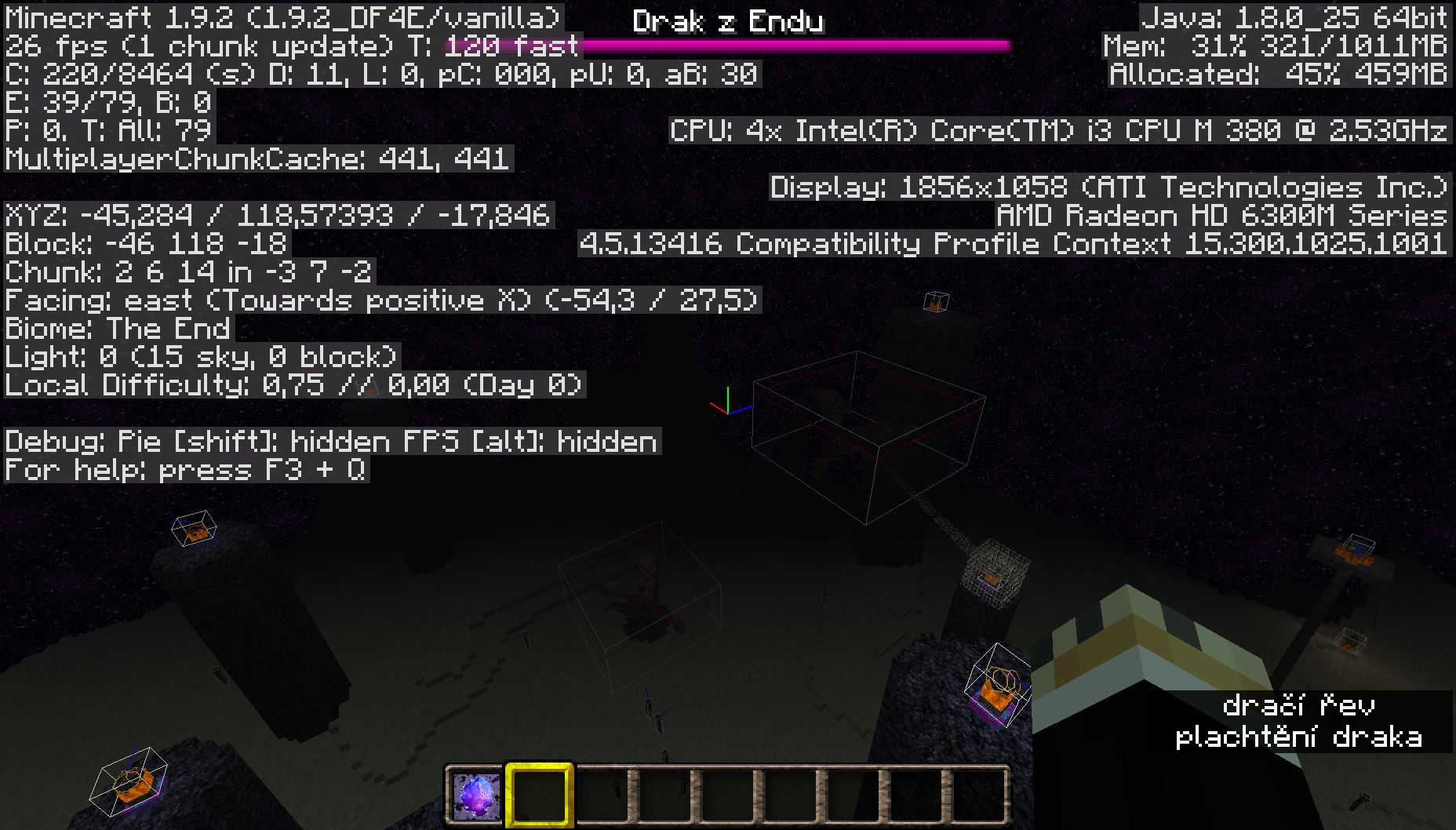 I've enter the End at Realm server which was set by Mojang translation managers. The Ender Dragon was stucked on one place in the air. He did not touches anything. The health bar was not displayed and the dragon was not attacking and I was not able to kill him with normal way, so I have killed him with the /kill @e command later. Before I killed him, I spawned the another dragon by placing the End crystals around the End fountain. The new, spawned dragon was behaved normal.