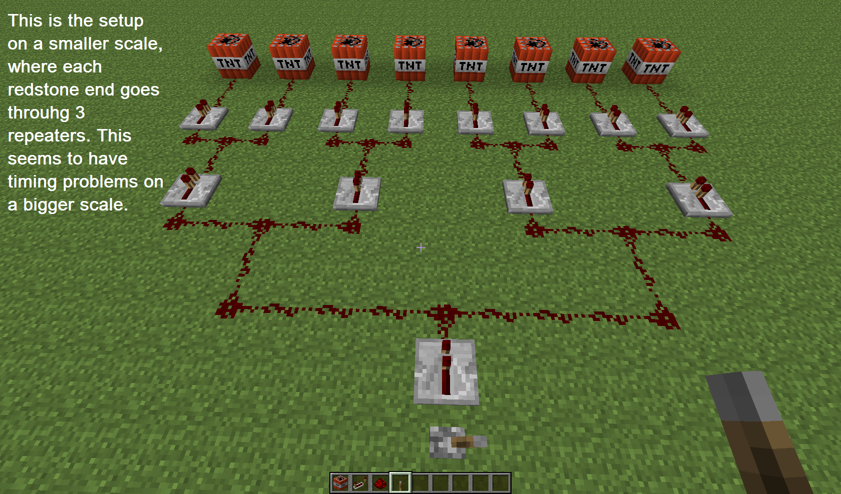 Supposedly, repeaters have not been doing their timing in sync. Maybe two weeks before this was posted by me, repeaters were able set off TNT simultaneously and with no problems, did. They are having problems now... I've tried to set all the repeaters to face strictly the south, and at other times in a couple of different directions which changed nothing.