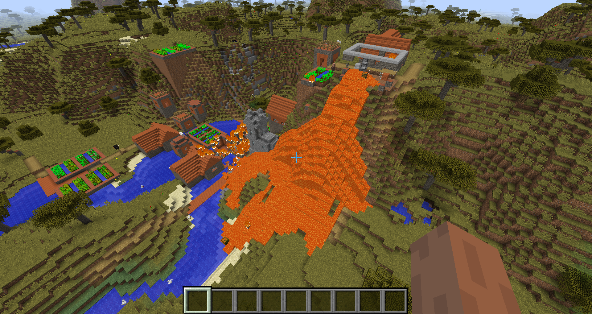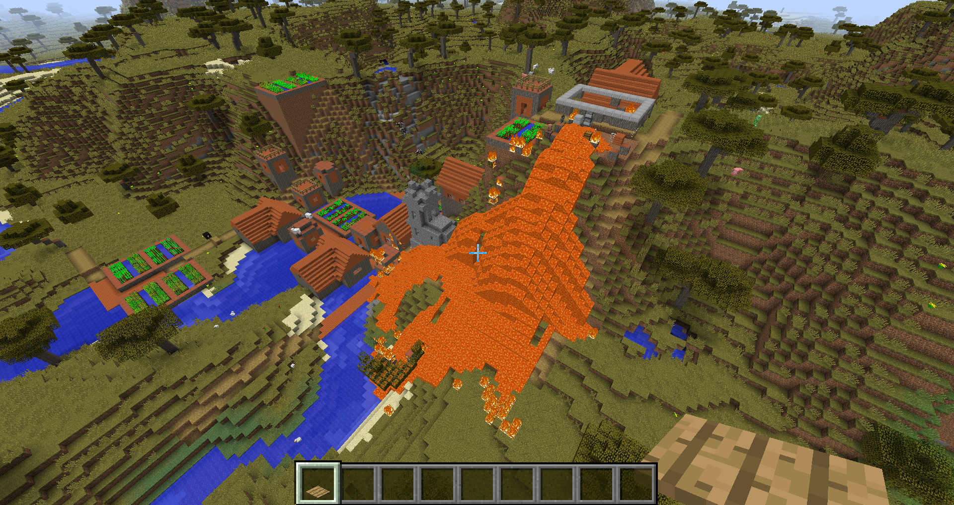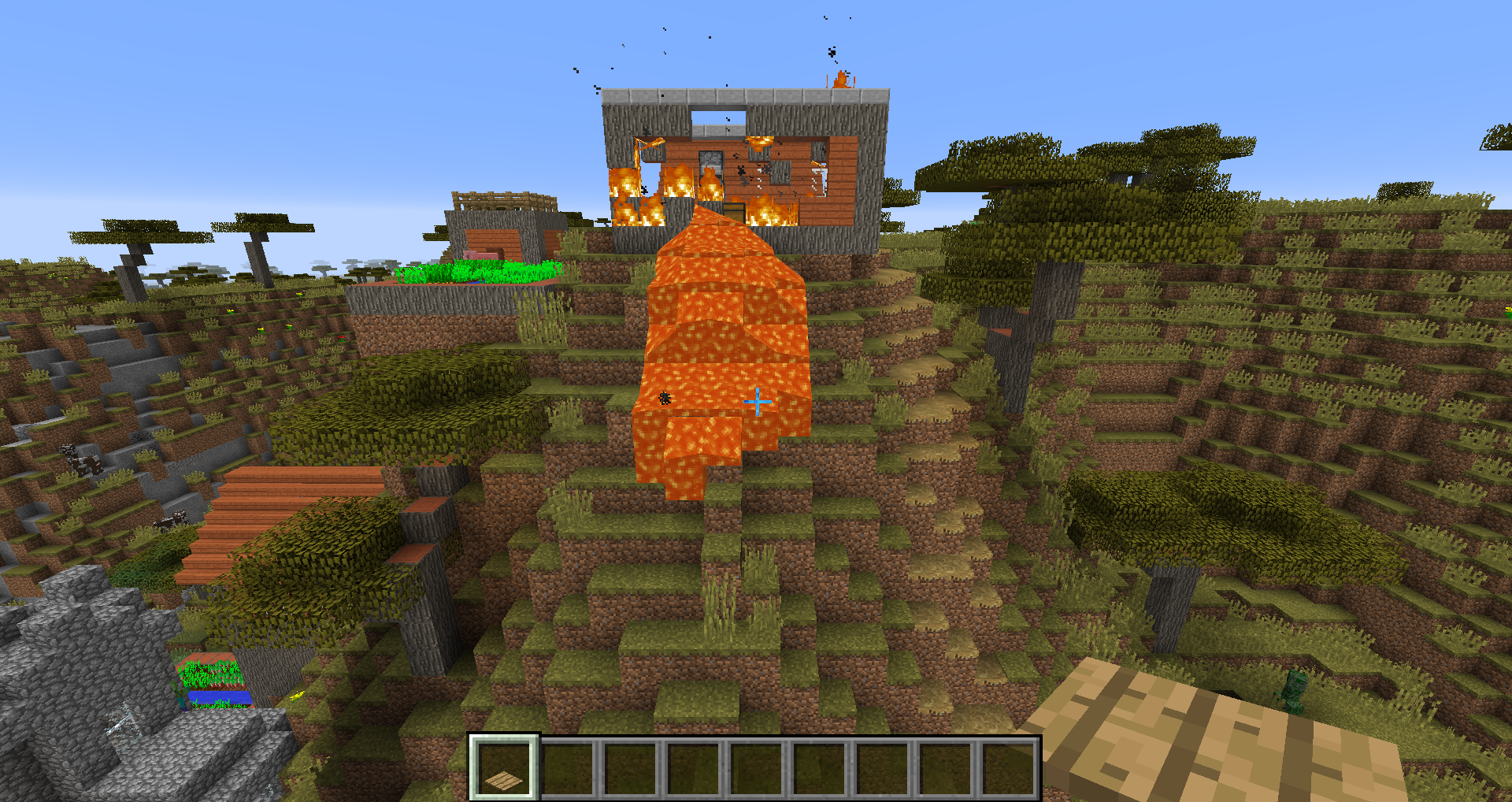 Savannah villages now use acacia wood more than before, including in blacksmith shops. The lava source blocks in these structures used to be surrounded by cobblestone, but are now surrounded by acacia wood which will catch fire. Usually this results in the entire building burning to the ground, allowing the lava to spill out and destroy other buildings. This has happened in every single savannah village I have seen in this snapshot so far (about 4 or 5). This might not technically count as a "bug", but it definitely seems like something that needs to be fixed.