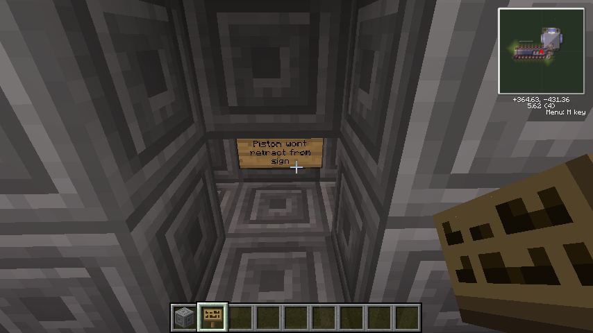 Used a sticky piston to hold a chiseled stone block as a 1x2 door, used to teleport player once opened. found if a sign was behind the top chiseled block the sticky piston will fail to retract despite power input.