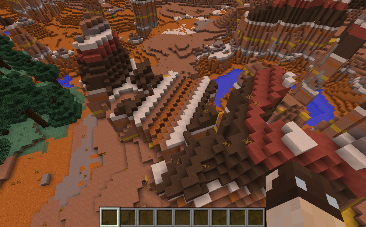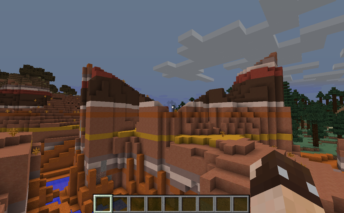 I'm not entirely sure if this is a bug in the game's code, or if it's specific to this seed, but there's an area of this world where the Mesa (Bryce) generates incorrectly with a wide 'V' cut into the hardened clay.