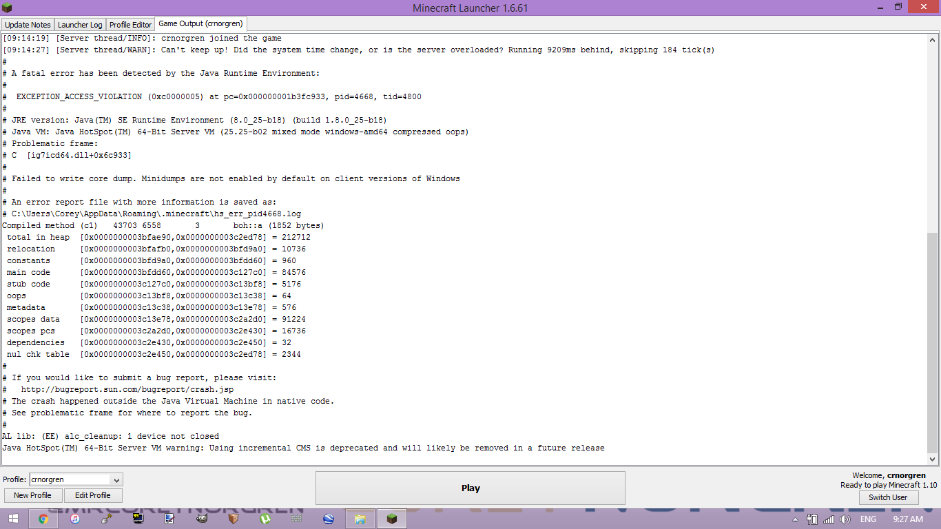 Any world I try to load weather it be old or a brand new world, all crash 10 seconds after loading. In version 1.9.4 everything is okay but as soon as I switch to 1.10 everything crashes. I have included a screen cap of the error I get.