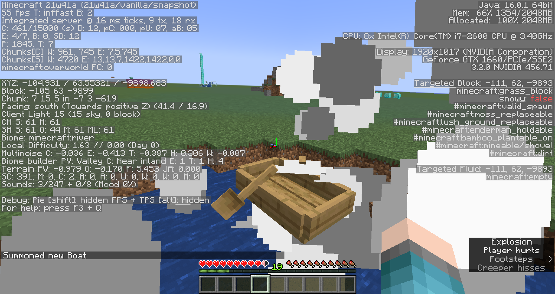 Take note as to whether or not creepers only deal half a heart of damage to nearby entities when exploding inside of boats.