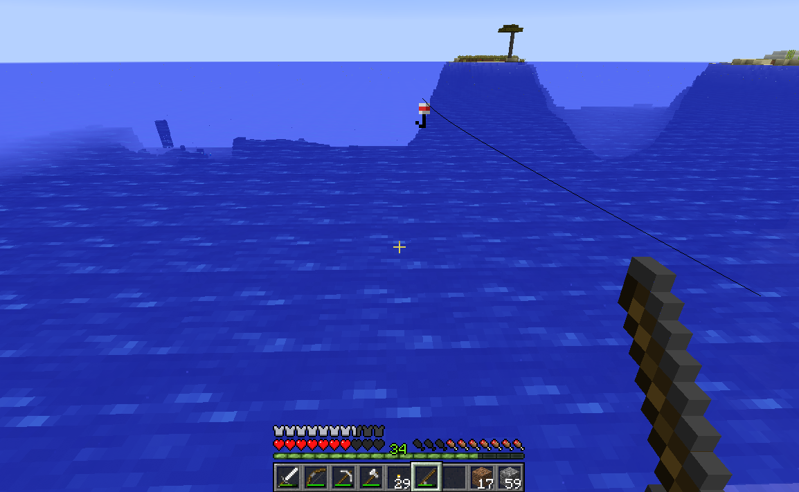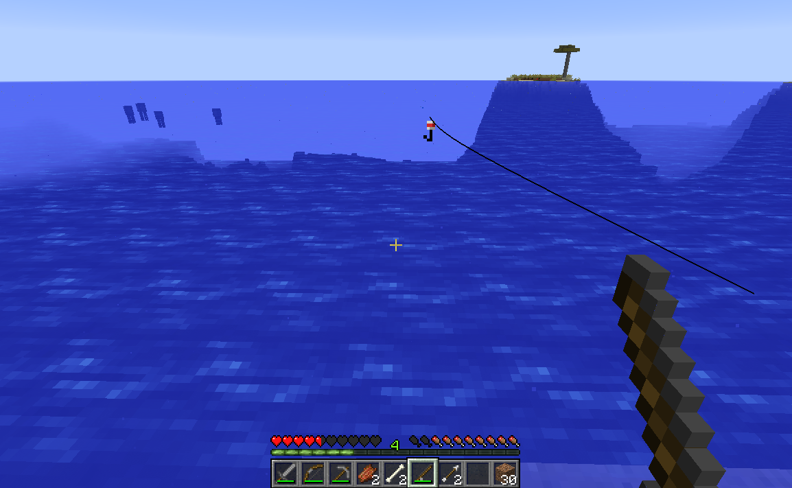 The line coming off of a cast fishing rod appears detached from the rod and coming from the block to the right of the rod.