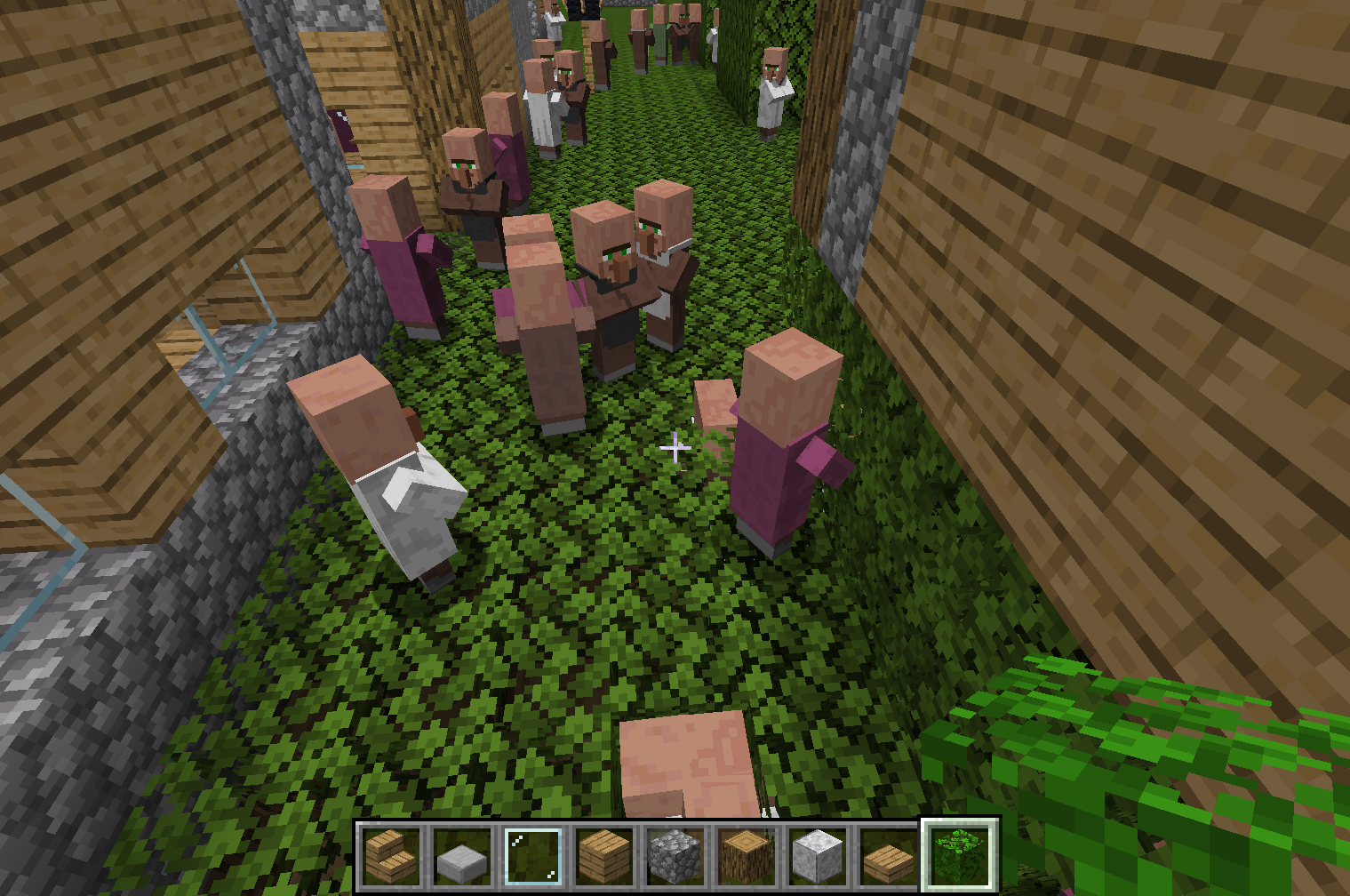 18w44a: Superflat village. Villagers spawning in leaves. Always clustering in large groups in small areas of large villages. Golems either still getting in the way or not spawning in the village at all. Created a superflat world years ago with leaves intentionally on every square, because it's fun to dig the villages out. In the more current versions of the game, the villages spawn on top of the leaves instead of inside, & the villagers spawn underneath the houses in the leaves.