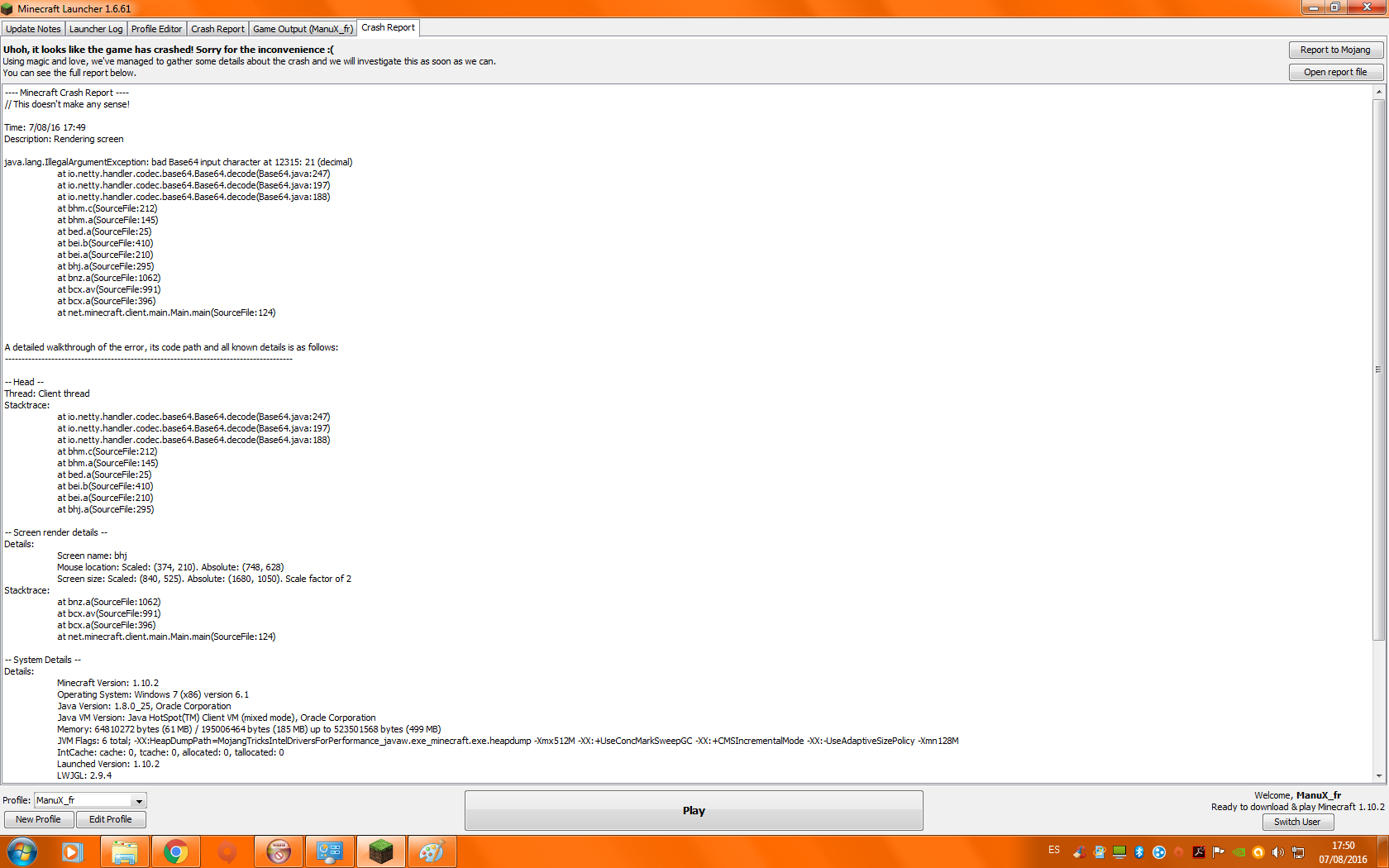 Your version of Minecraft is no longer supported. We are currently only accepting bugs found in the official release 1.10.2. If you can reproduce this crash in the latest version, please attach the crash report (minecraft/crash-reports/crash-<DATE>-client.txt) here.