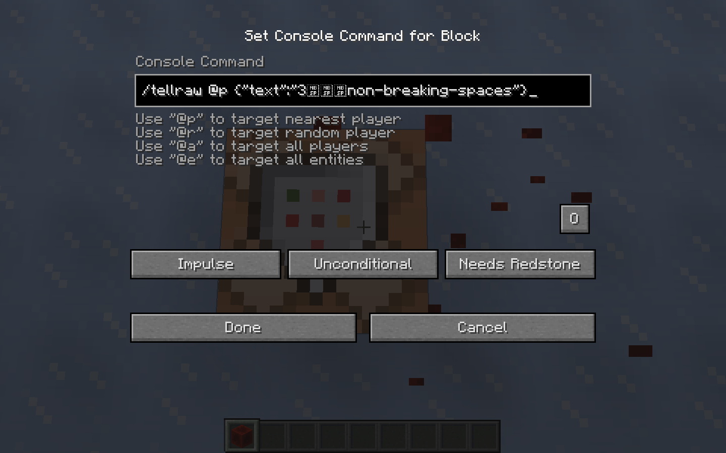 3 non-breaking-spacesI thought the bug was that multiple nb-spaces are omitted in a command when you run it directly as a player while they aren't when you run it in a command block. Didn't catch the "bugged" character part for some reason.