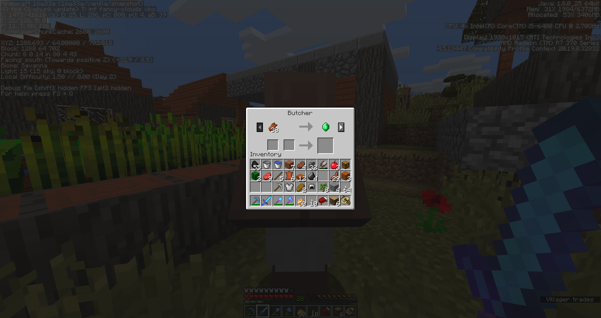 When I was exploring the world in snapshot 16w33a, I came across a village and wanted to trade with some villagers. But I stumbled upon a 'Butcher' with a cleric trade. I reloaded the game but it did not resolve the issue. The villager has a butcher texture along with the name but it has a cleric trade (e.g. Rotten flesh for emeralds).