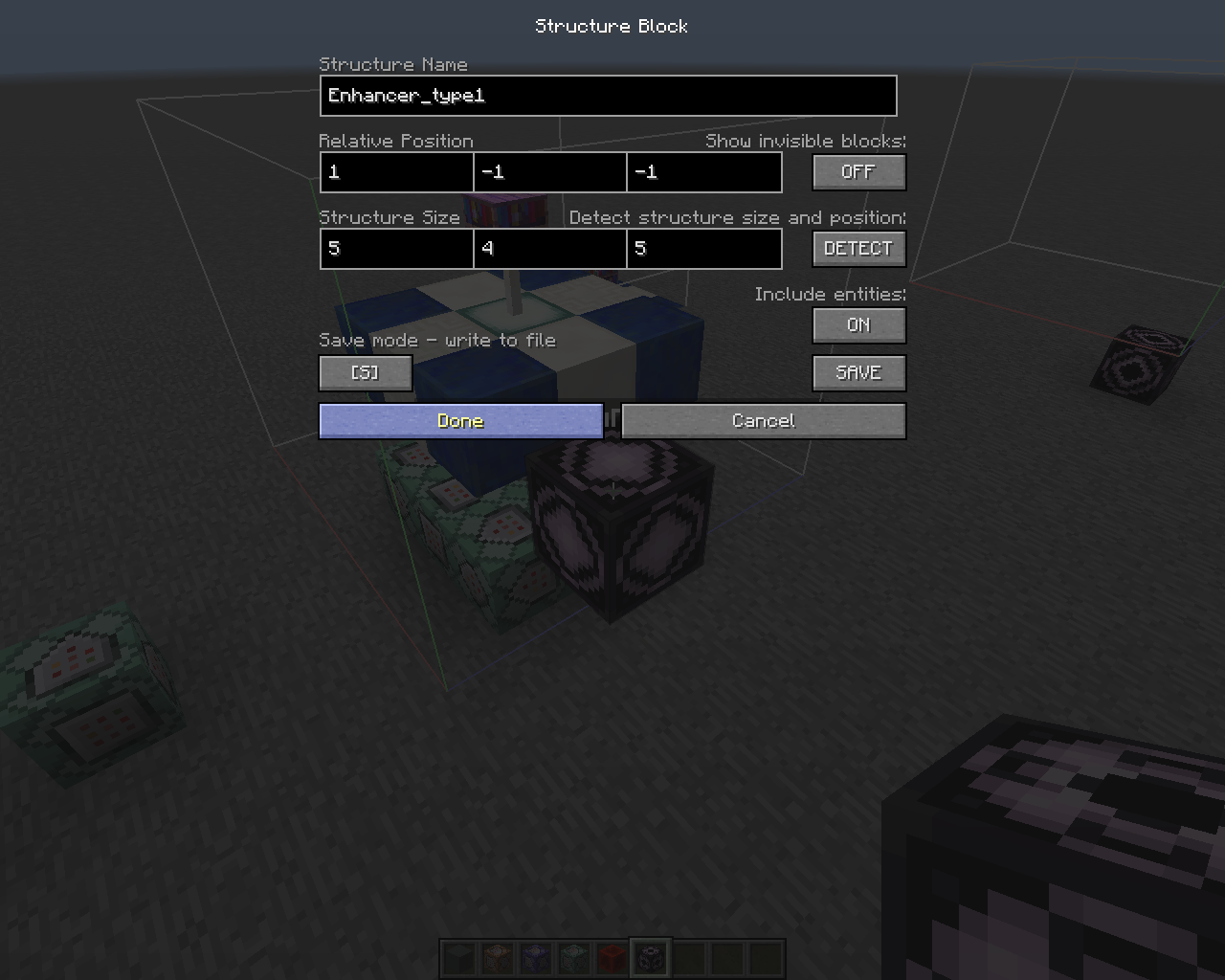 I was toying with the Structure block, and tried to save my structure which is made of stacked entities: a Shulker and a FallingSand riding a small ArmorStand on the same level.(1st screenshot)
