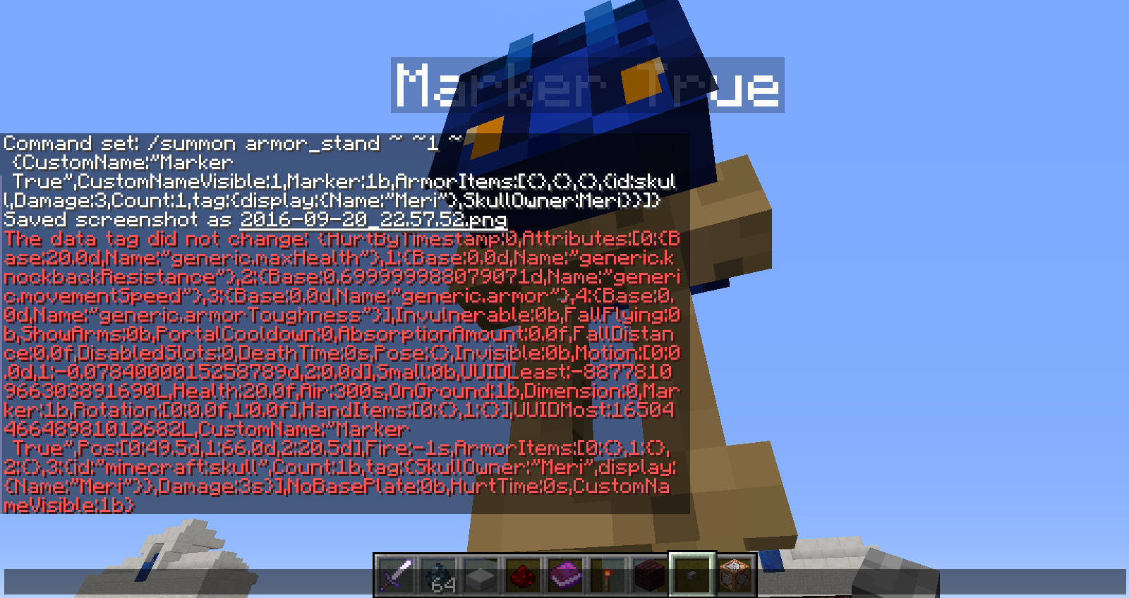 /summon armor_stand ~ ~1 ~ {CustomName:"Marker True",CustomNameVisible:1,Marker:1b,ArmorItems:[{},{},{},{id:skull,Damage:3,Count:1,tag:{display:{Name:"Meri"},SkullOwner:Meri}}]}If more issues occur due to the AS change, I'll add them of course.