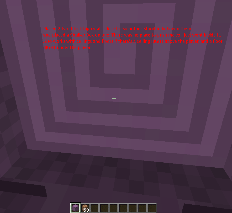 Simple bug: You can place Shulker Boxes inside of yourself. Just face down while standing on a solid block and try to place a Shulker Box. Instead of not being able to place it like it should, you can actually place the Shulker Box (even though the player gets immediately teleported above the box).