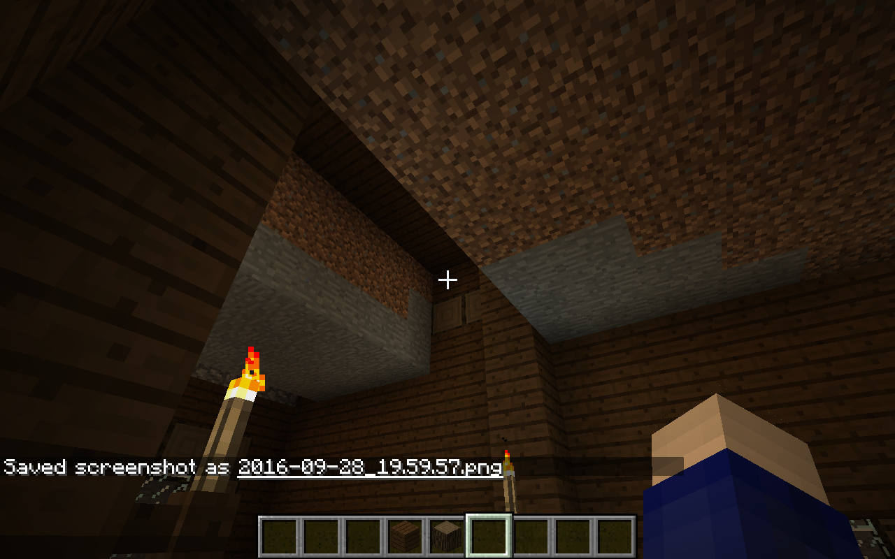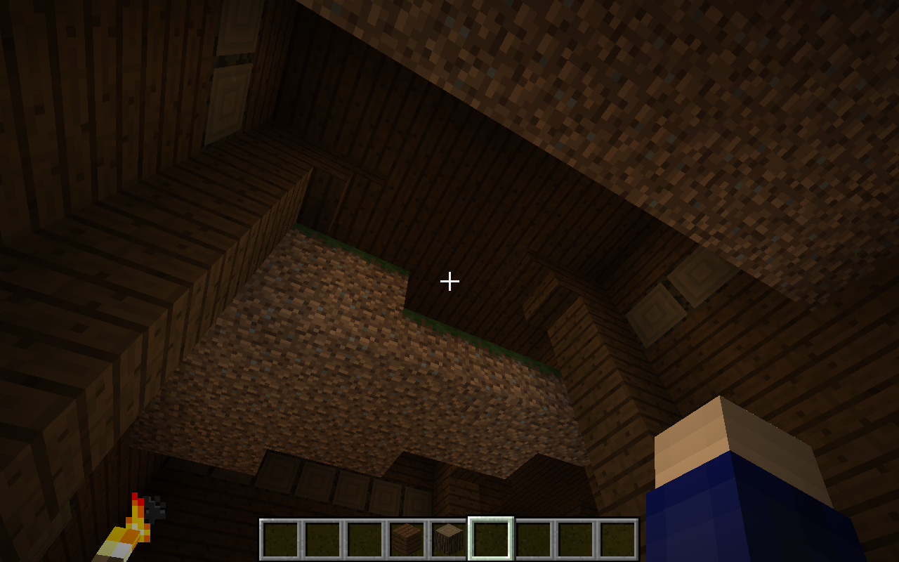 In the second floor of a woodland mansion, there was stone, dirt, and grass block chunks on the ceiling.