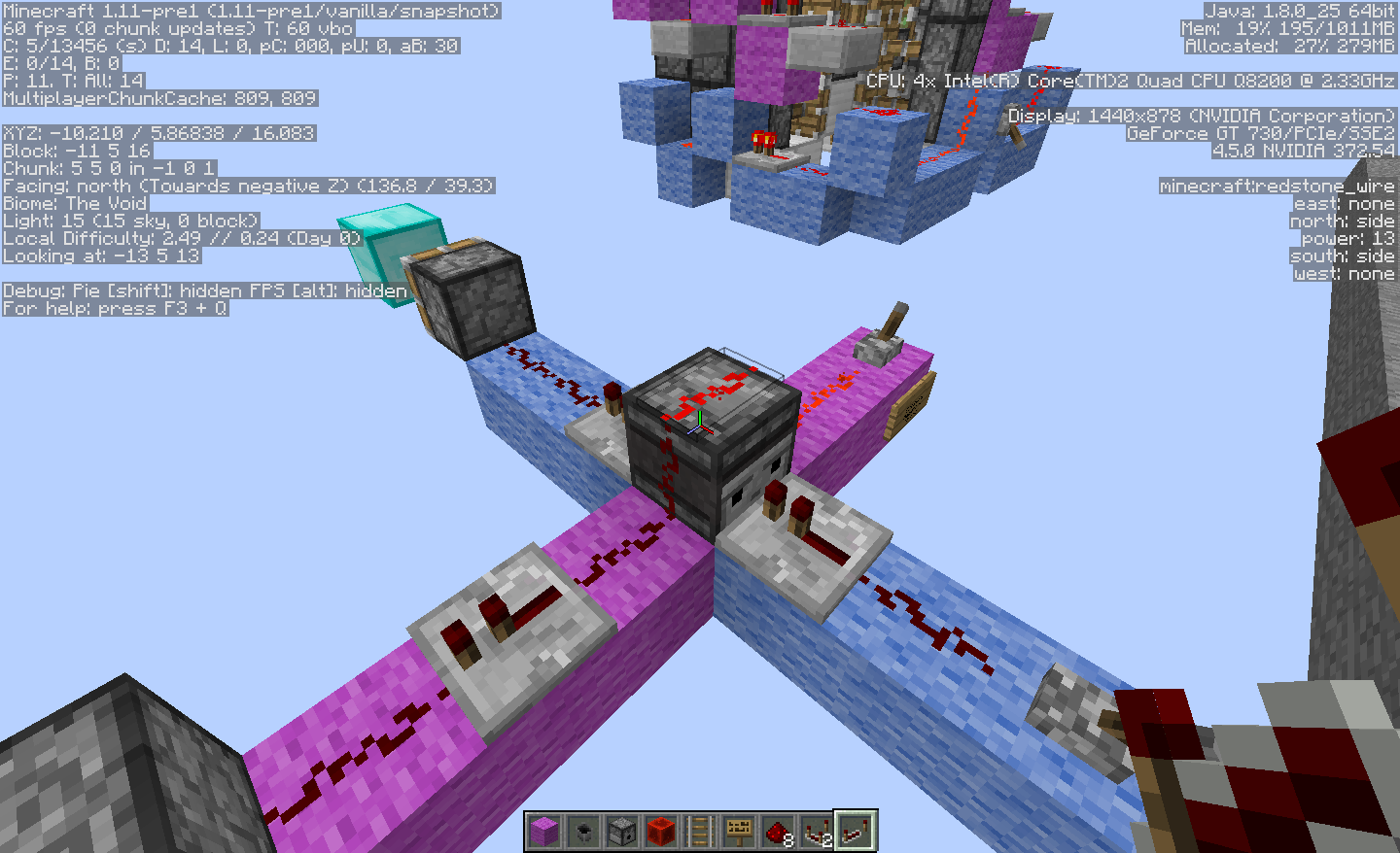 When you try to run redstone up the side of observers blocks it doesn't go back down. Not much more to say. There are more specifics of my pc info in the screenshot. Thanks in advance!