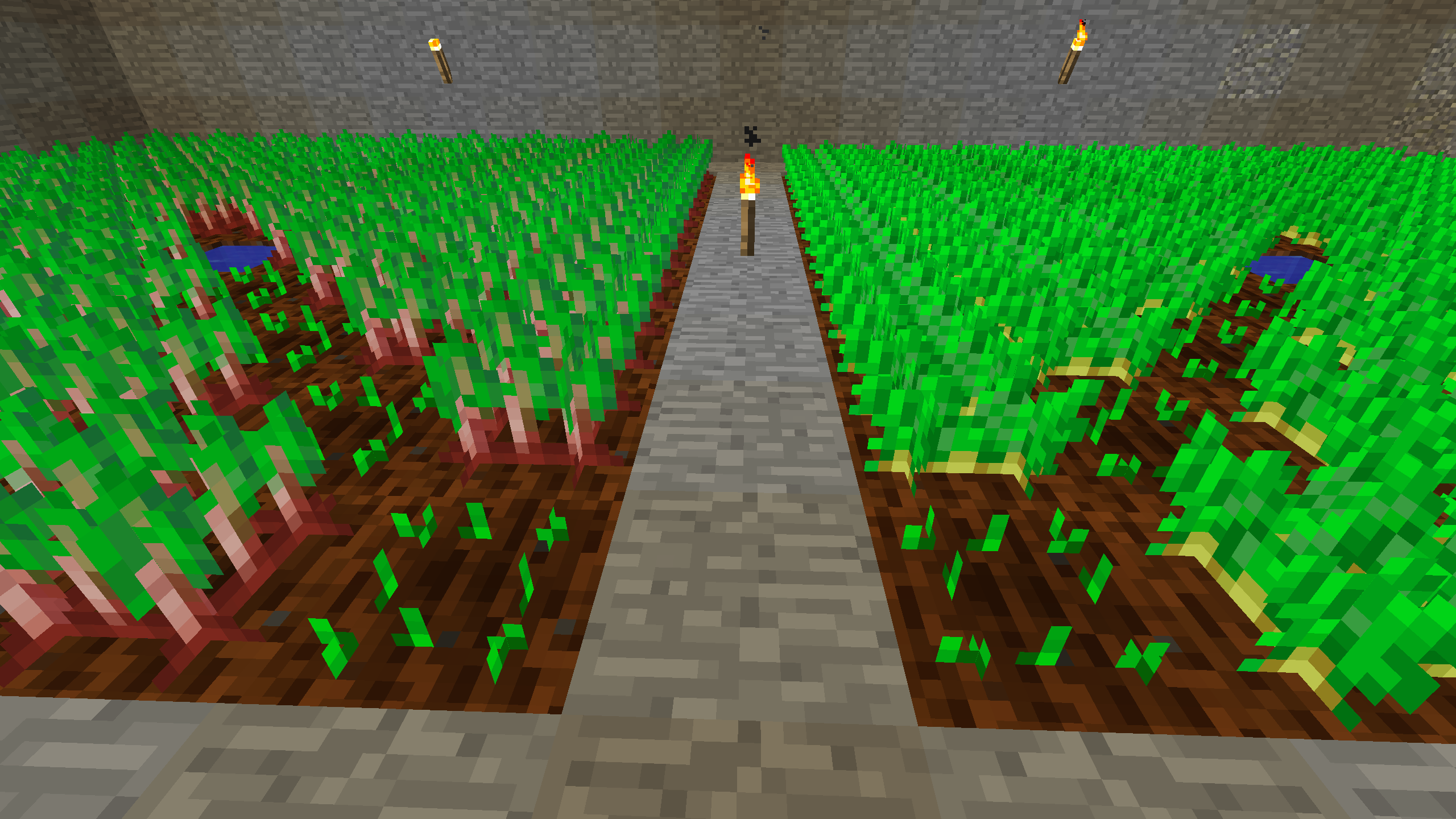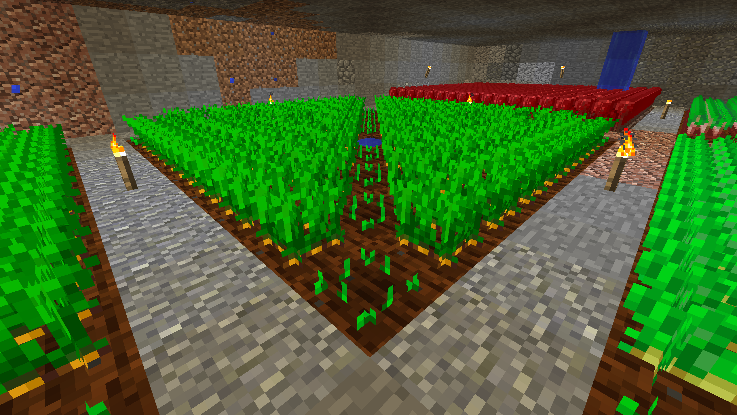 So I've been playing on my survival save for quite a while now,and I realised that some crops that I placed underground do not grow at all,and that the crops that didn't grow were all diagonally next to each other. They all extend from the water source to the end and I couldn't find any pattern of the ungrown crops.