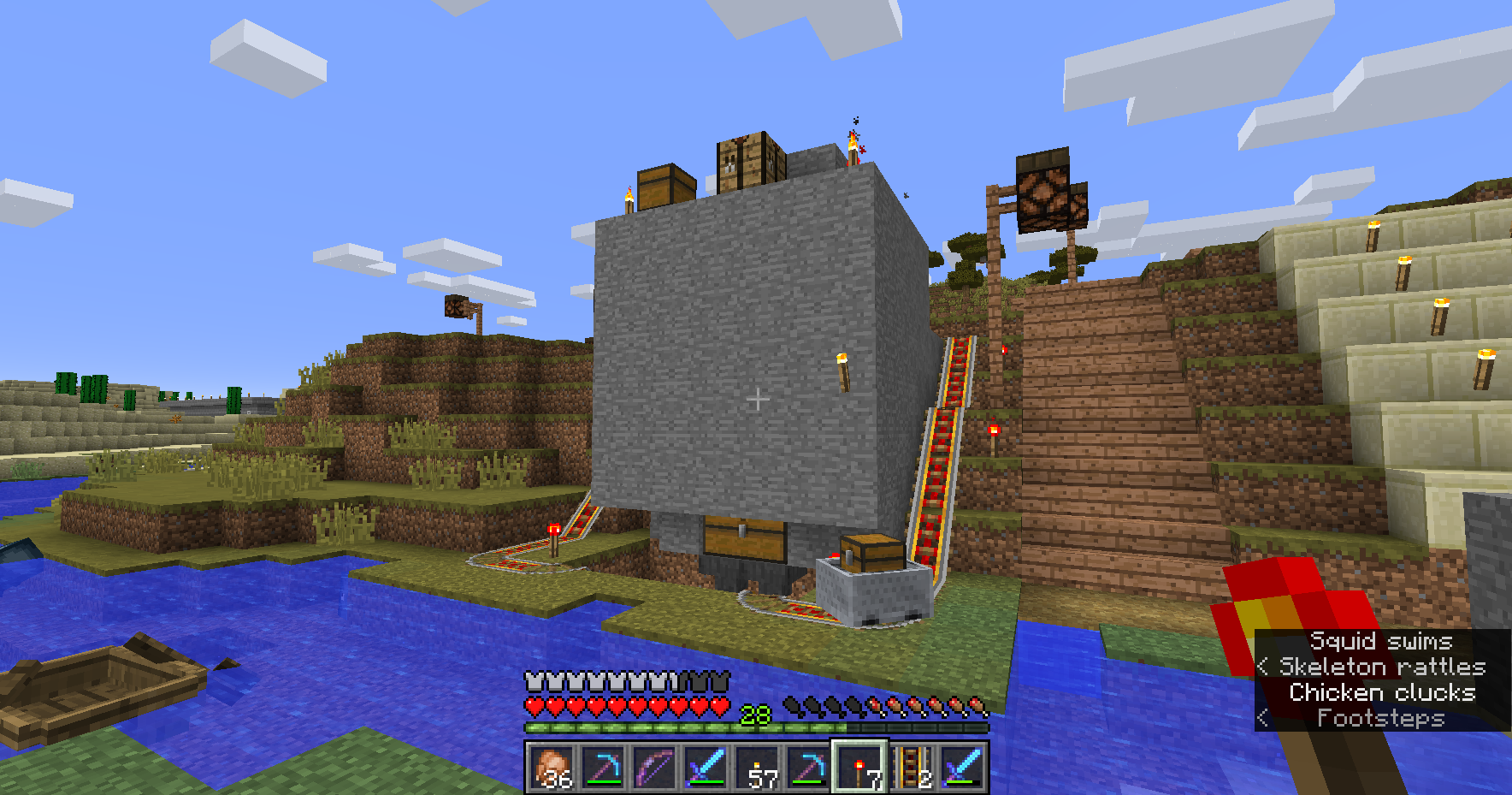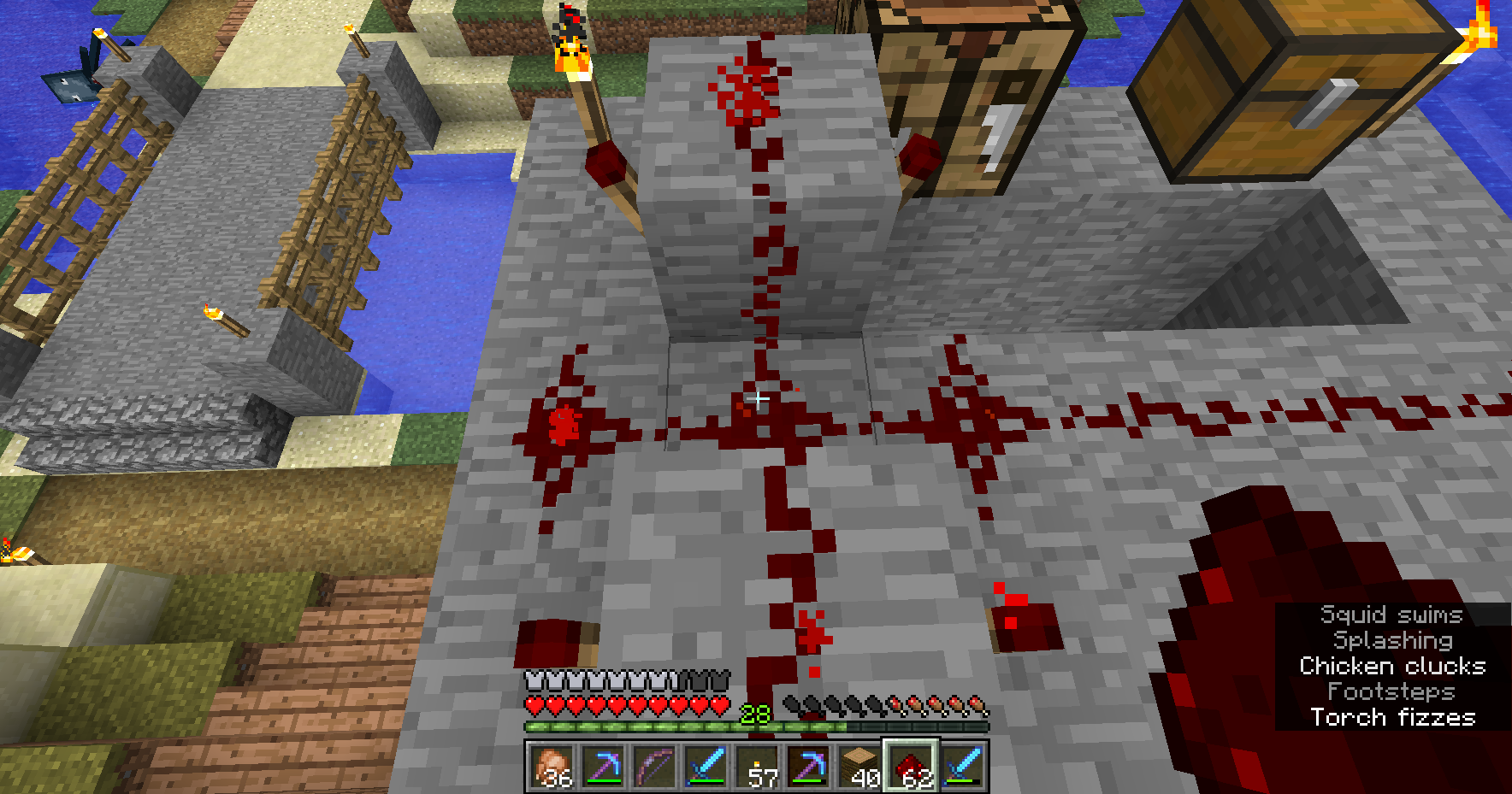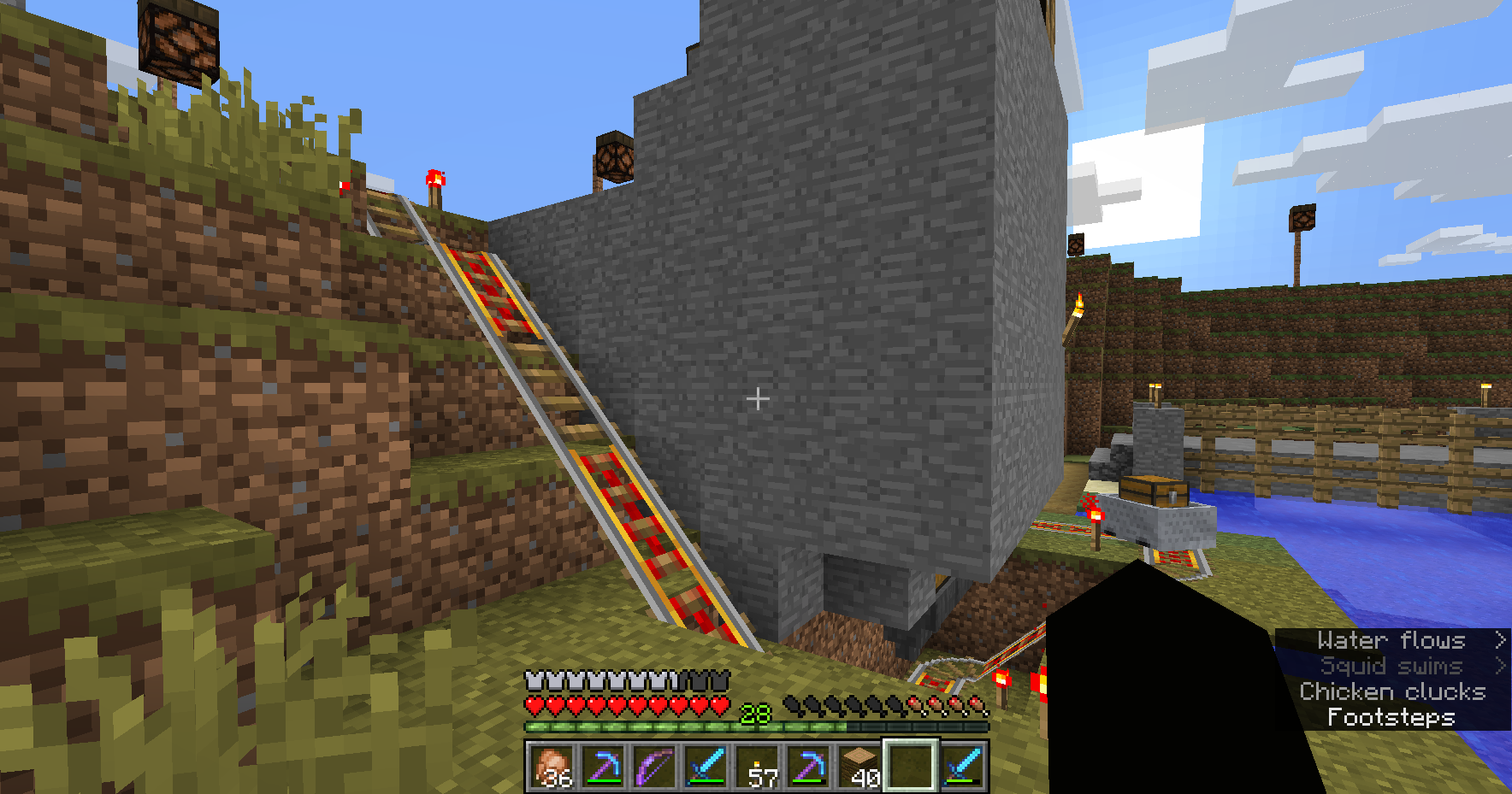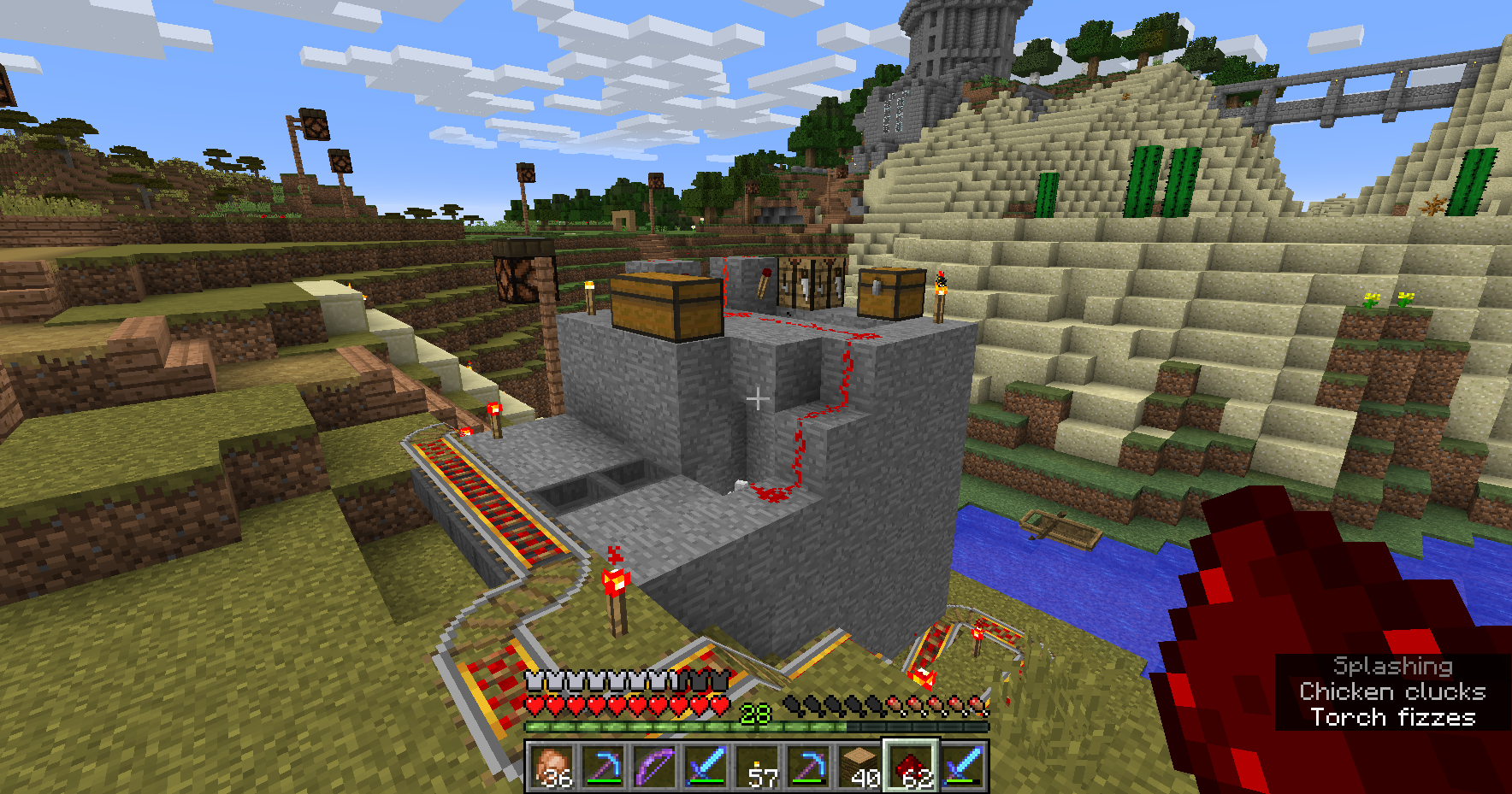 My issues revolve around a little chicken farm I've made and replicated pretty consistently for probably a couple years. It's essentially just a a room that keeps chickens with hoppers covering the floor, feeding eggs into a box outside of the room, feeding into two more hoppers that feed mine carts that pass under it. The track the cart is on goes around the outside of room going up and down slants that lead from the bottom of the box on one side to the top of the box on the other and running over hoppers along the top. These hoppers feed into a dispenser that's powered by blinking redstone torches. It worked fine before and still largely does. I just ran it until eggs overflowed and threw in a couple dmg potions to get exp while I got the meat