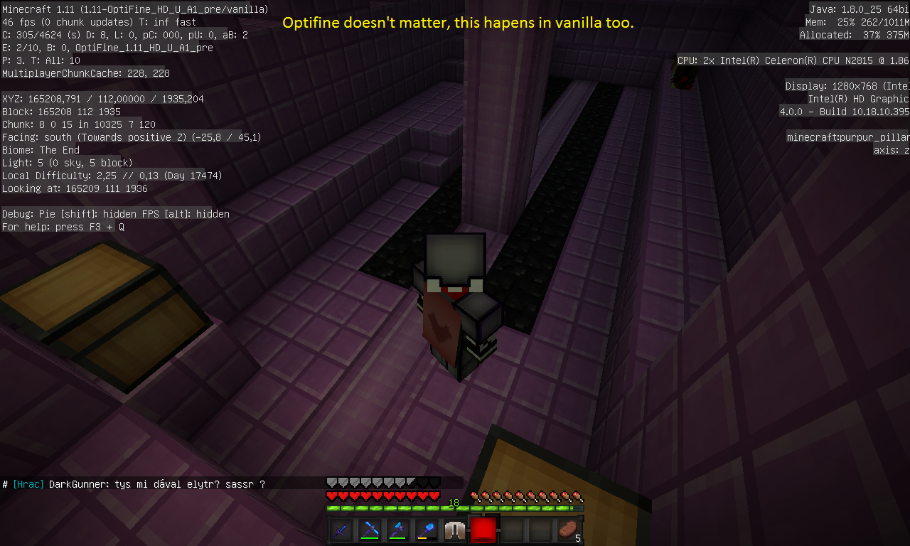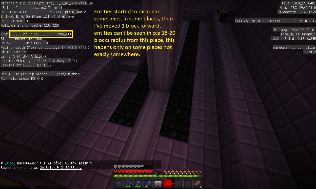 I've just noticed sometimes I go to F5 (I do it really often) I can see that my character is missing or it's invisible, but it's not only with me, also other players/mobs are disapeared, they're there but I can't see them. This hapens in some places, mostly after I get farther from spawn XY 0 about 100k blocks or more this hapens more often. Also, I've asked the other player if it's only me or it's global, as he said it was same for him.