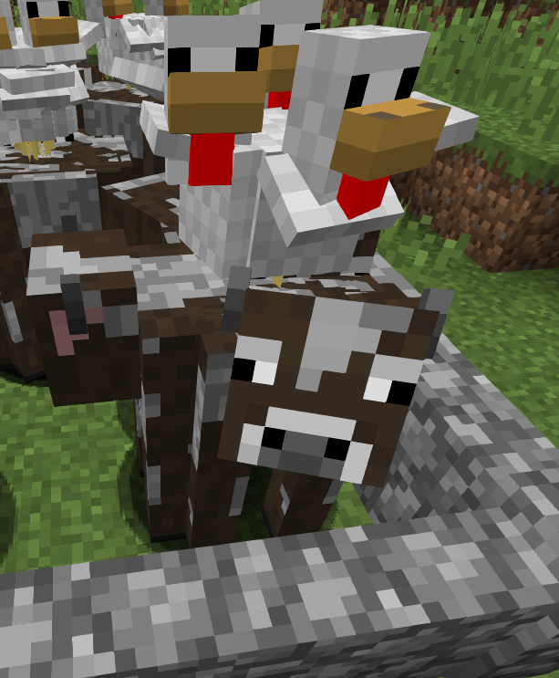 /summon minecraft:cow ~ ~ ~ {Passengers:[{id:"chicken"}]}Linked issues