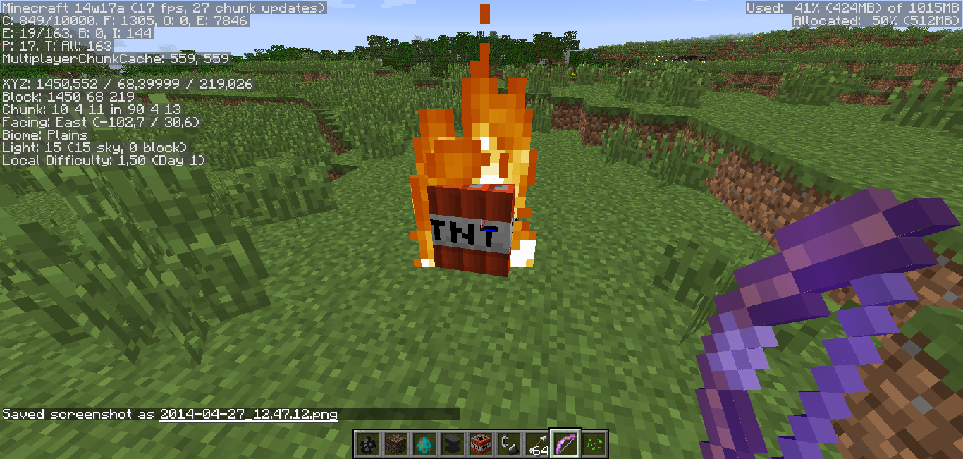 We all know Primed TNT is an entity, yeah? Well, all entities can be hurt. So, what do you get when you cross Primed TNT with a flaming arrow? You get TNT on fire, which I'm not sure can be fixed. It might take a long time, but primed TNT could stay as a block and stay where the TNT was all the time for it's short little fuse. Anyway, here's the bug.
