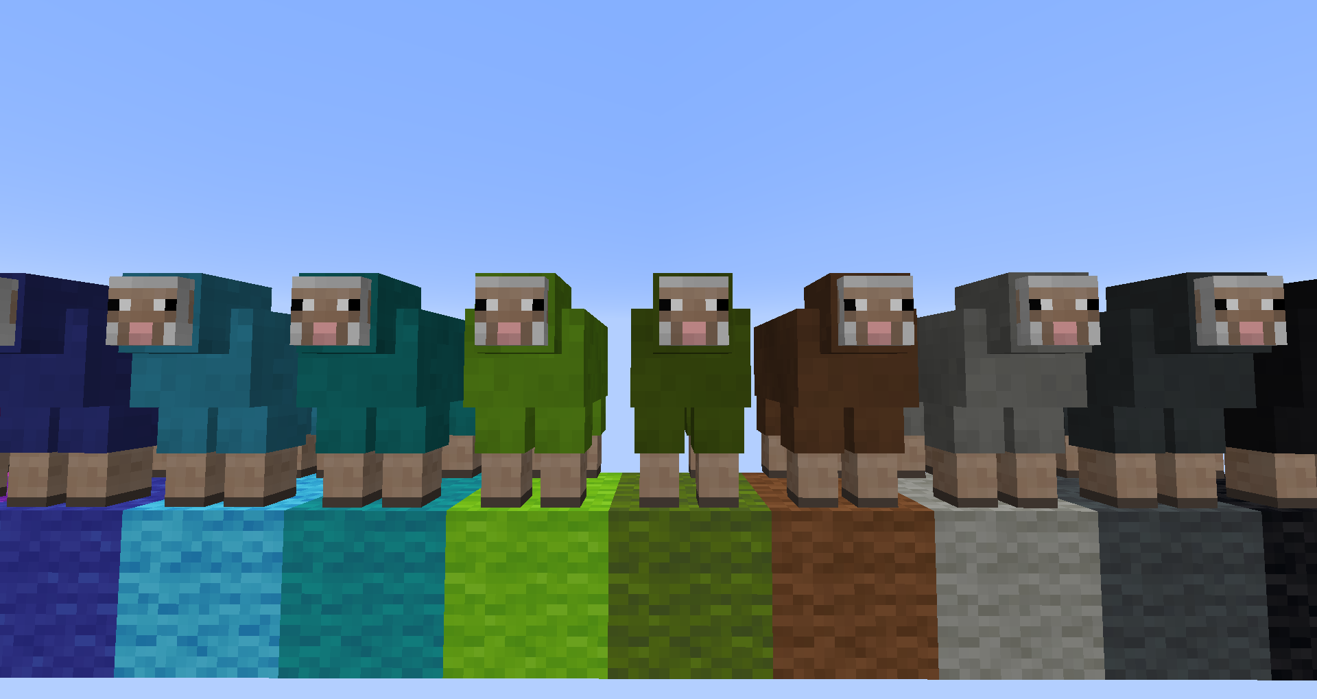 I'd like to point out, now that I saw all dyed sheep on top of their according wool they drop (see attached screenshots), I figured that Mojang apparently gave all sheep with no exception a bit of a "dirty" colour. I can get why, for once it's more like real life, where wool is usually not bright-white, and also sheep in Minecraft would maybe somewhat look odd/"plastic-fake" if their armour/wool would be as saturated-bright as the woolblocks they drop.
