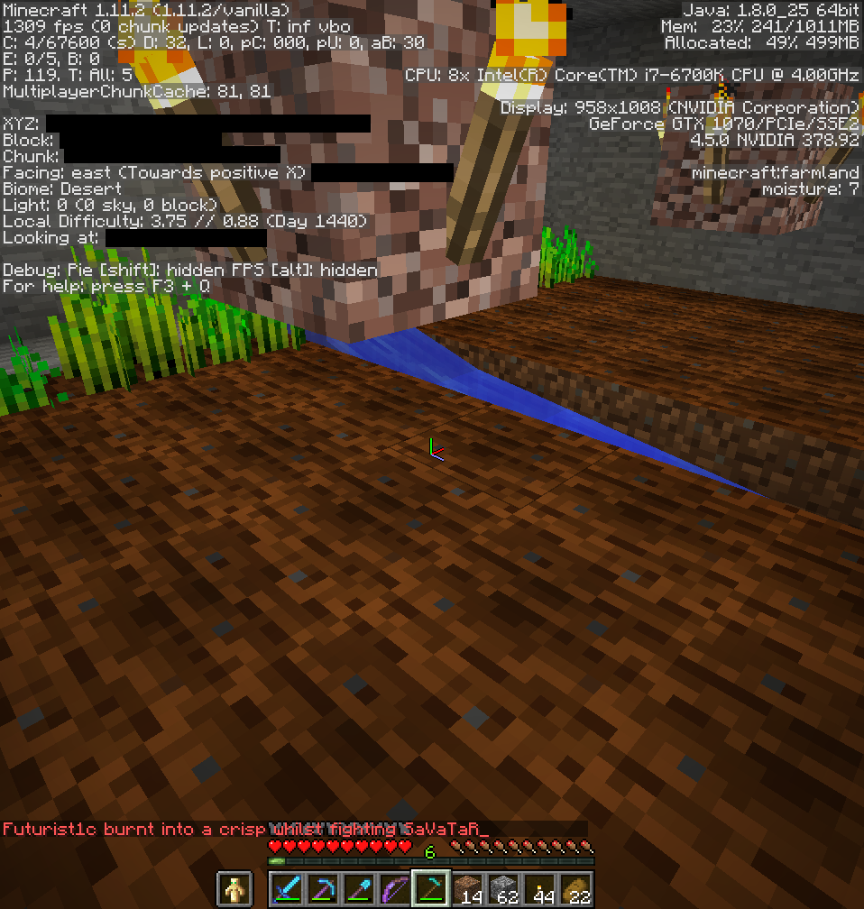 When standing on farmland, with the F3 overlay enabled the light value does not show. The room is well lit with torches. The coordinates are blacked out because this is on a anarchy server.