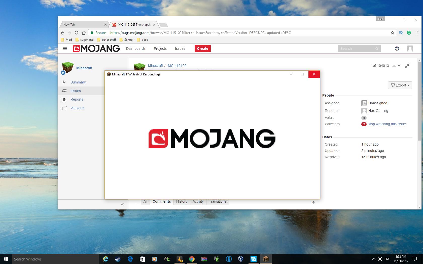 In case of a game crash, be sure to attach the crashlog from [minecraft/crash-reports/crash-<DATE>-client.txt|http://hopper.minecraft.net/help/guides/finding-minecraft-data-folder/].