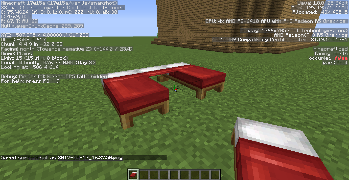 When opening my world from version 1.11/1.11.2, the bed that I placed inside my home was not visible but still usable. This may be from the new colored beds? It also appears that placing the correct bed next to it fixes the head texture but not the foot. Tested this on two worlds with the same effect.