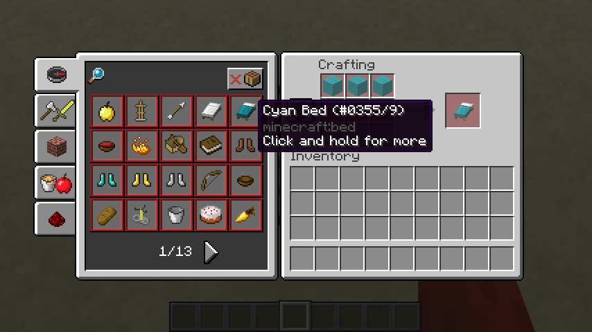 In 17w15a, the bed can now be crafted in two ways; using a particular colour of wool, and being dyed from a white bed. Now, items with multiple recipes normally have their recipes grouped in the recipe book (as shown in the first and second images). However since there are now 31 ways to craft a bed, it appears as two recipes in the recipe book (as shown in the third image). These recipes correspond to minecraft:<colour>_bed and minecraft:<colour>_bed_from_white_bed, respectively. This may be intended, however I doubt this as it only adds extra confusion.