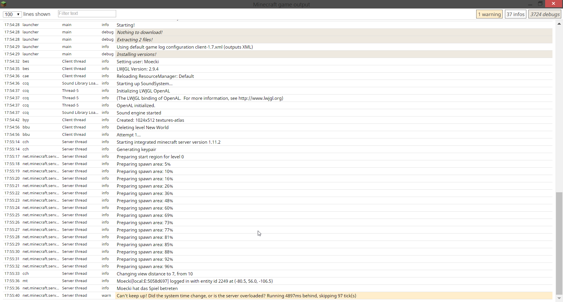 Minecraft crashed when entering a world (singleplayer or multiplayer). The console didn't show up any information about the crash. After updating the driver for the nVidia graphic card the window was still open. There was about 20 seconds where the game reacts. Then the screen holds and the game crashed. There was still no information about a crash. Also no crash reports where generated at the standard location. The only information the log shows is that minecraft can't keep up the system. It's running over 4000ms behind and skipping about 80 ticks.