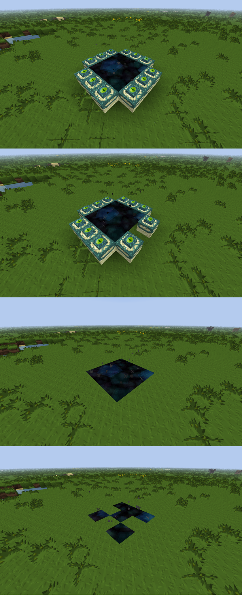 After placing an enderportal frame in creative mode and then inserting all eyes of ender the portal appears. If a part of the frame is removed or destroyed the enderportal still remains and the player can still travel through it. Even when all the frame pieces are removed the portal still doesn't disappear. It is even possible to remove parts of the portal and then travel through it.
