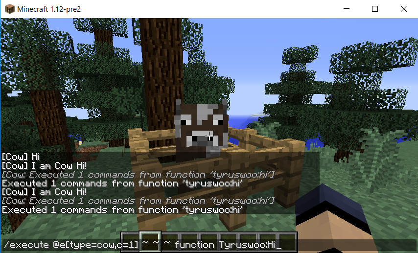 This worked in 1.12pre1 and 1.12pre2, but in 1.12pre3 it was broken, making me (the executor) say hi. My intent was for the cow (the target of the execute command) to say hi.